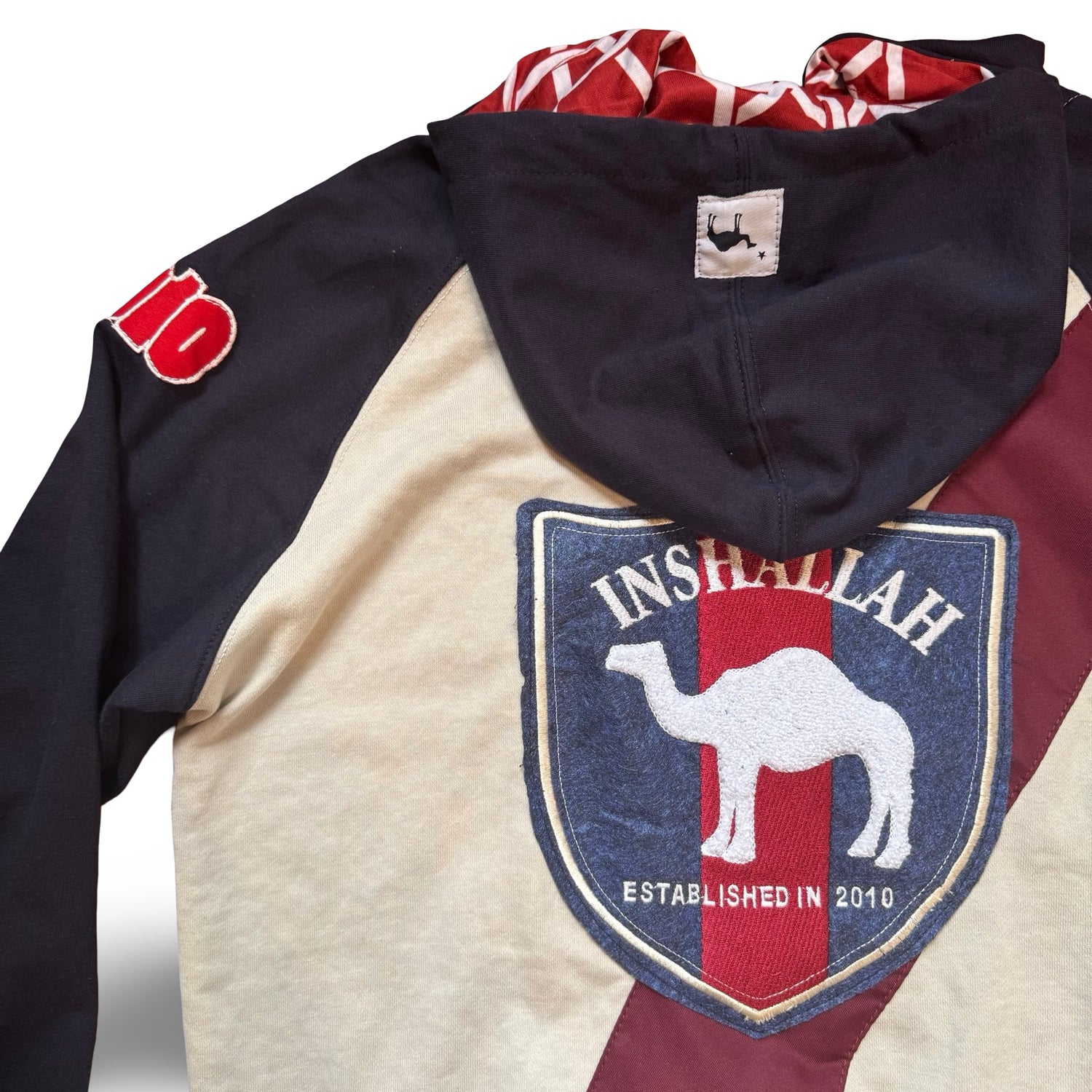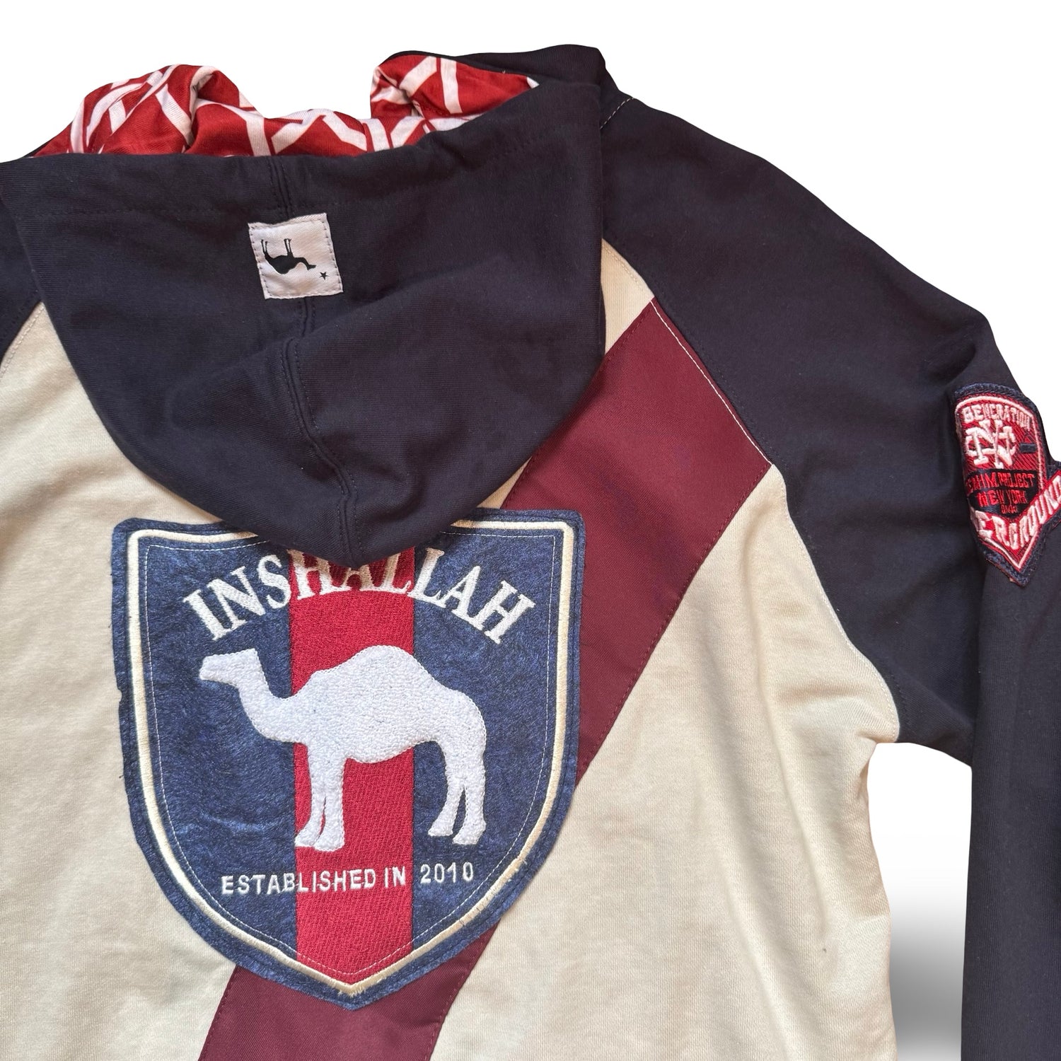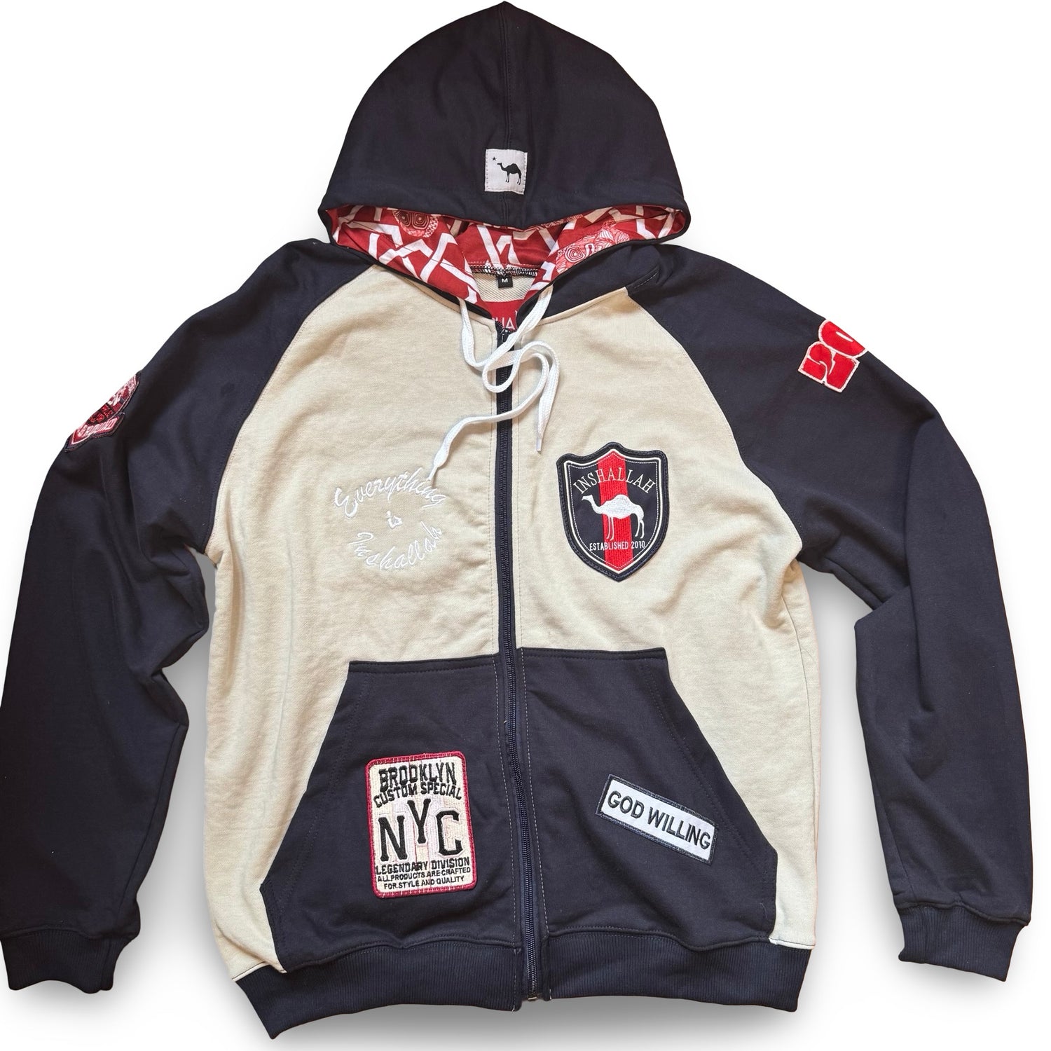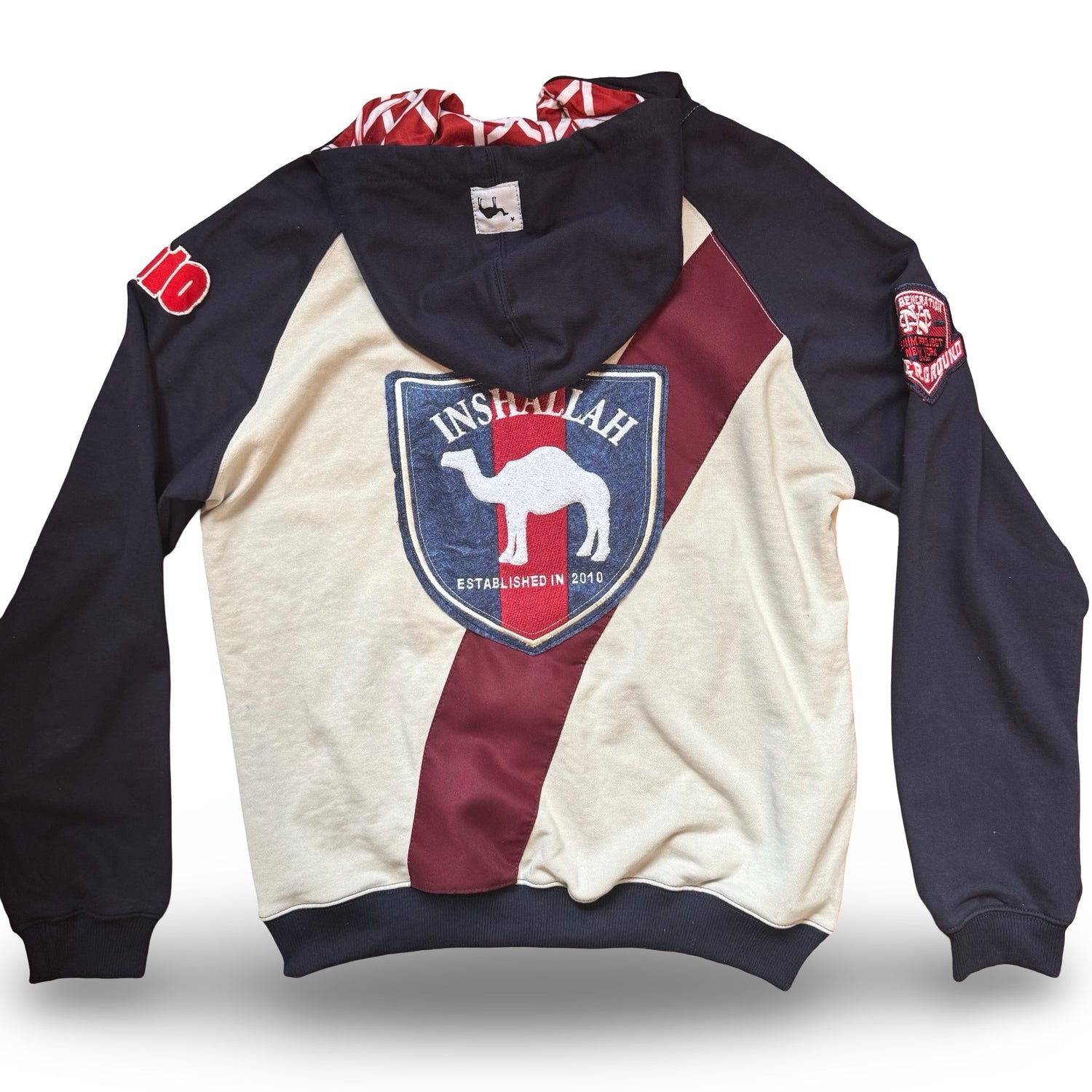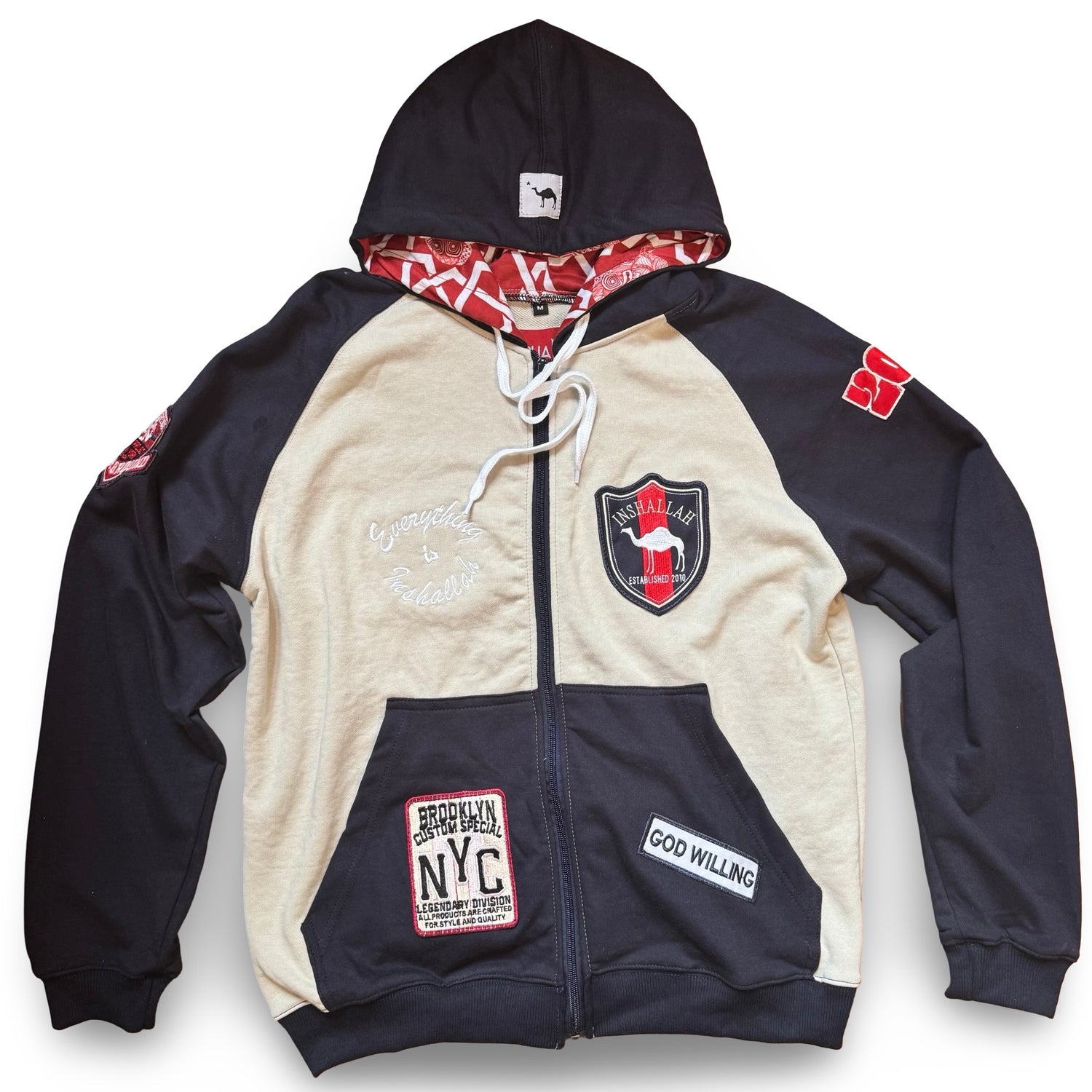 2 tone mid weight terrie cotton hoodie with heavy embroidery and appliqué patchwork detailing..
