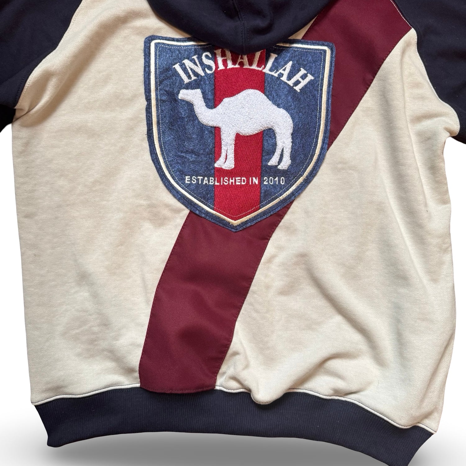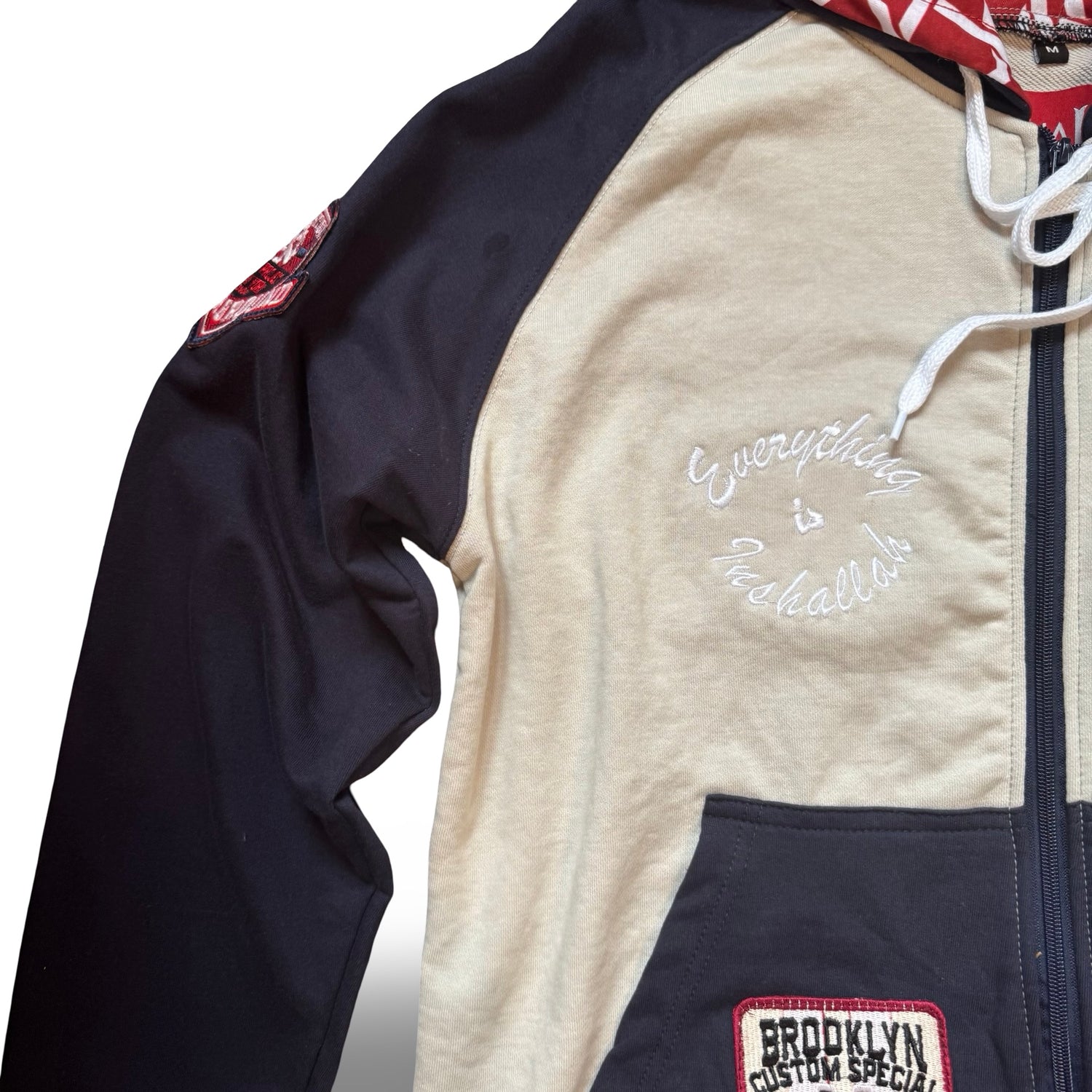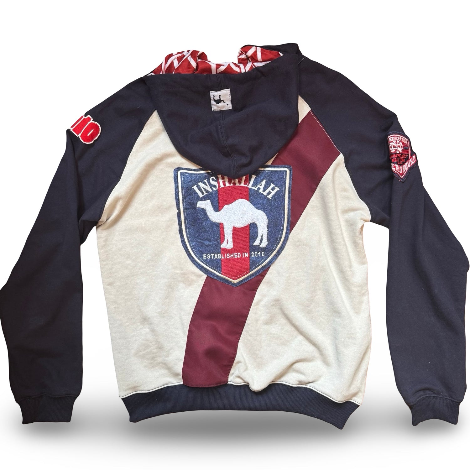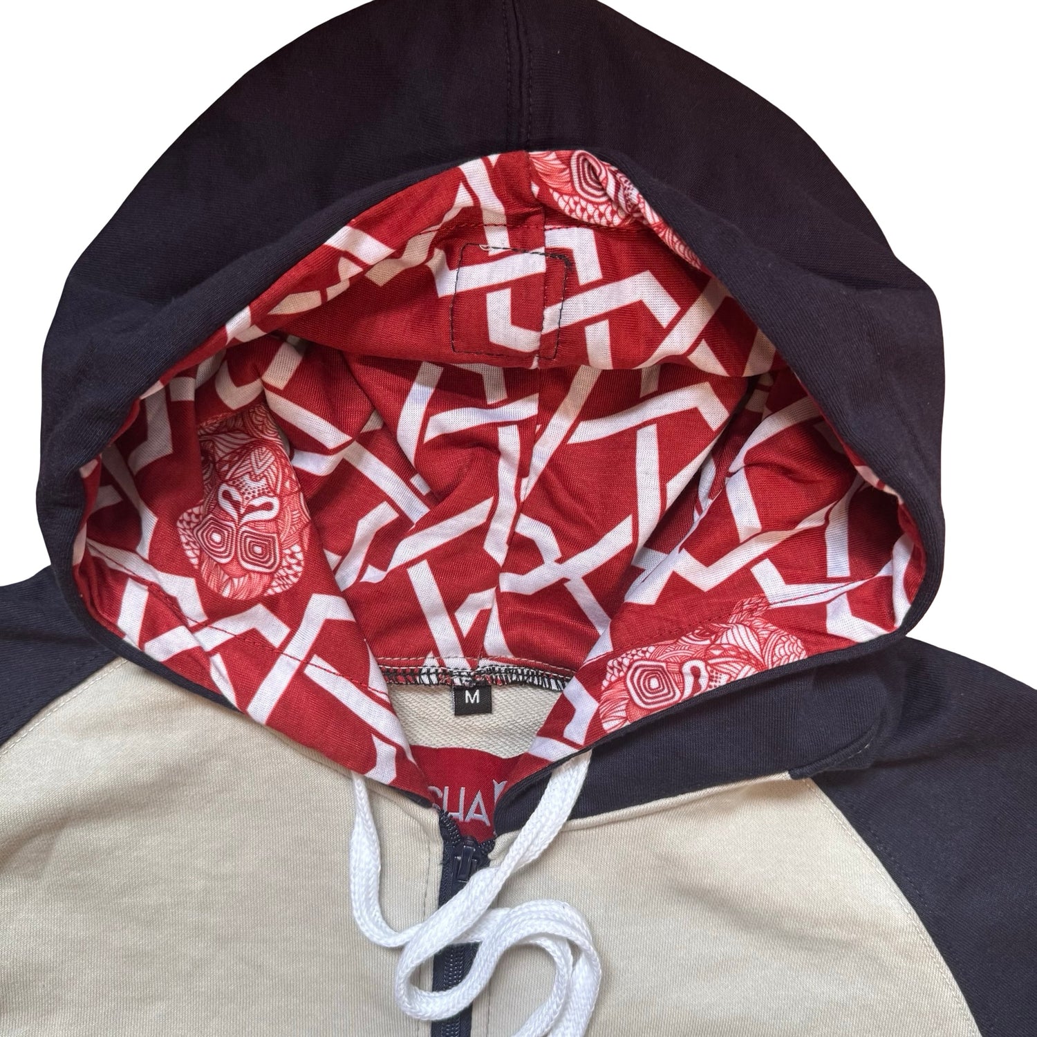 2 tone mid weight terrie cotton hoodie with heavy embroidery and appliqué patchwork detailing..