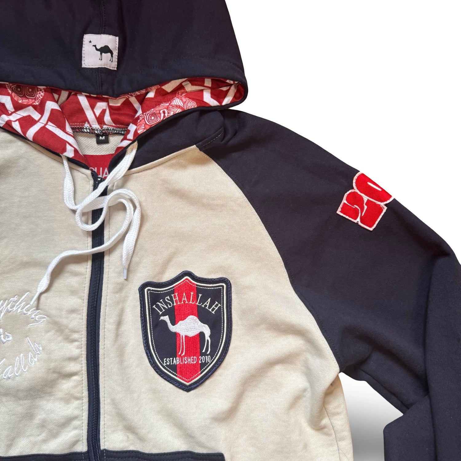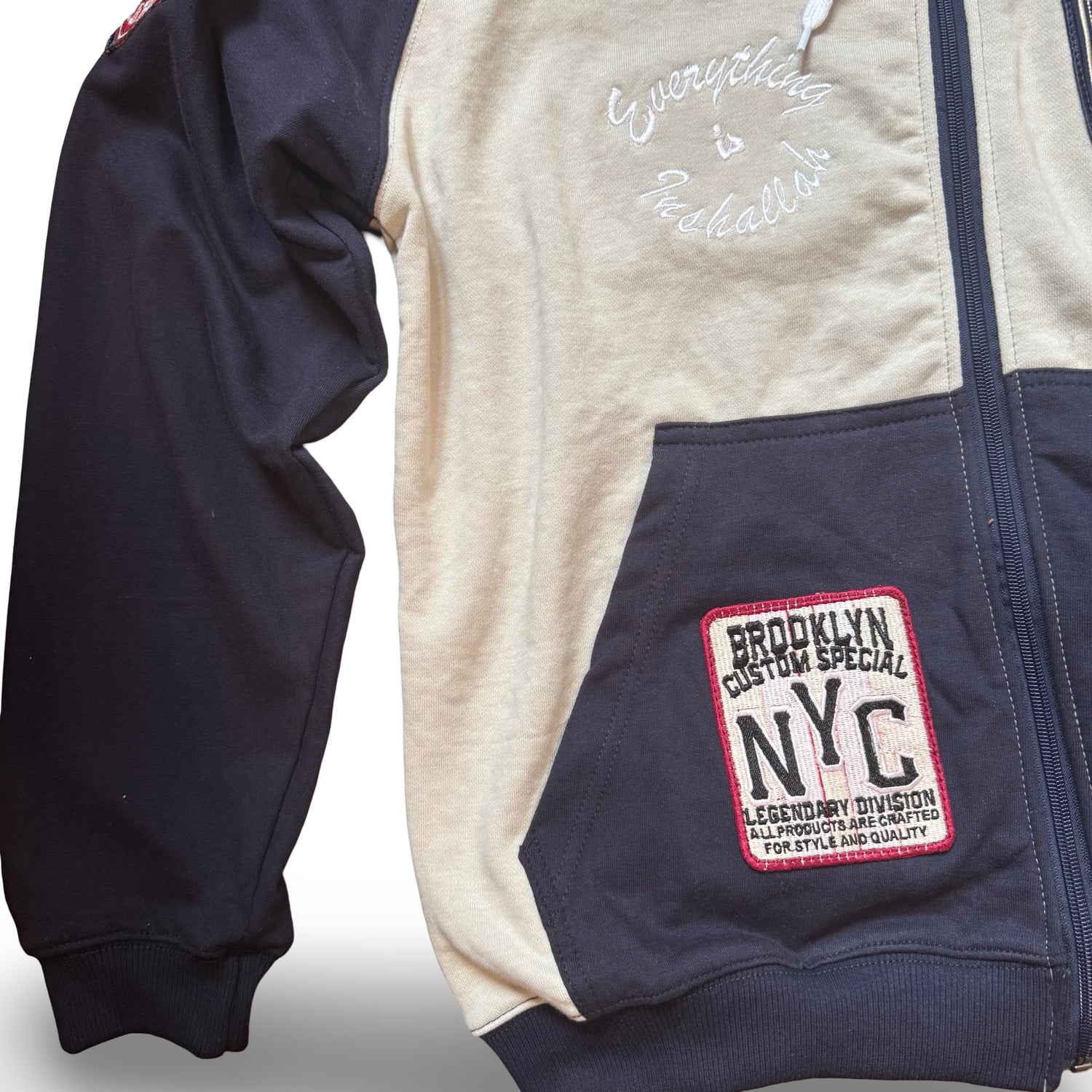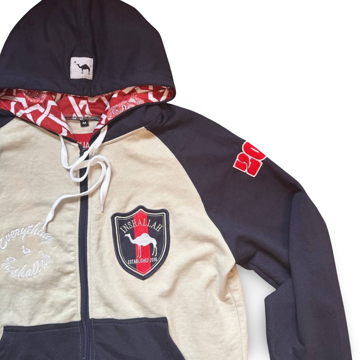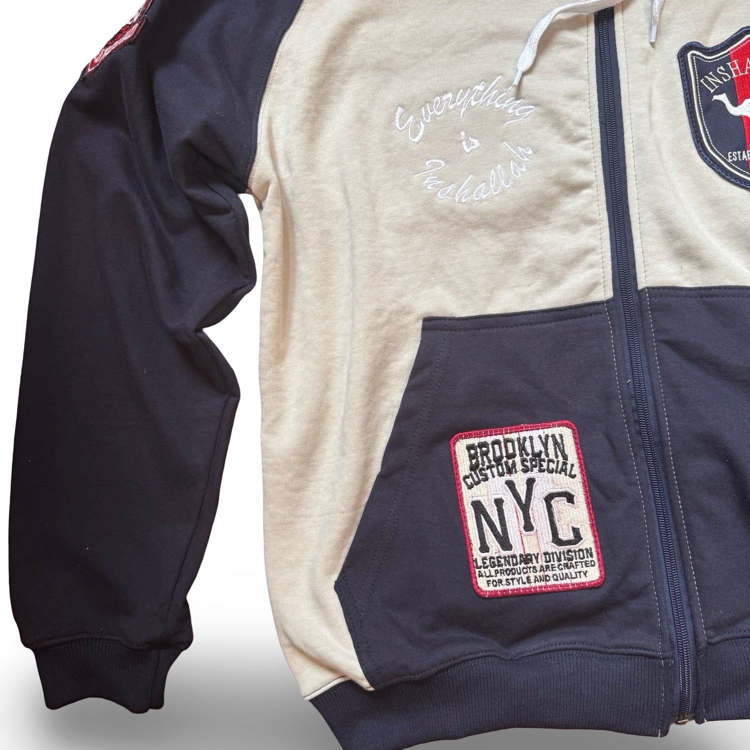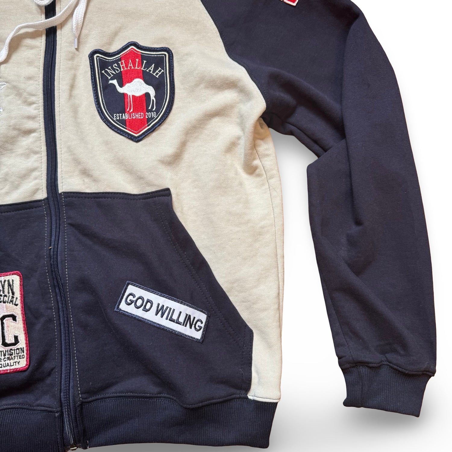 2 tone mid weight terrie cotton hoodie with heavy embroidery and appliqué patchwork detailing..