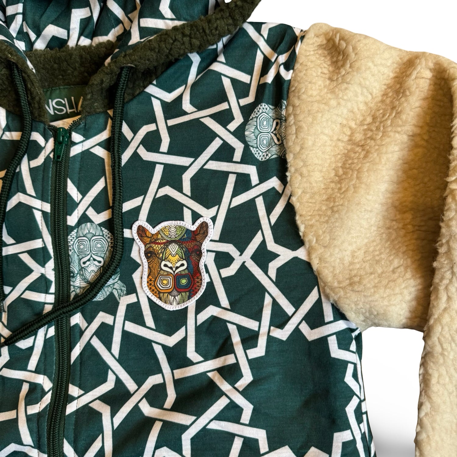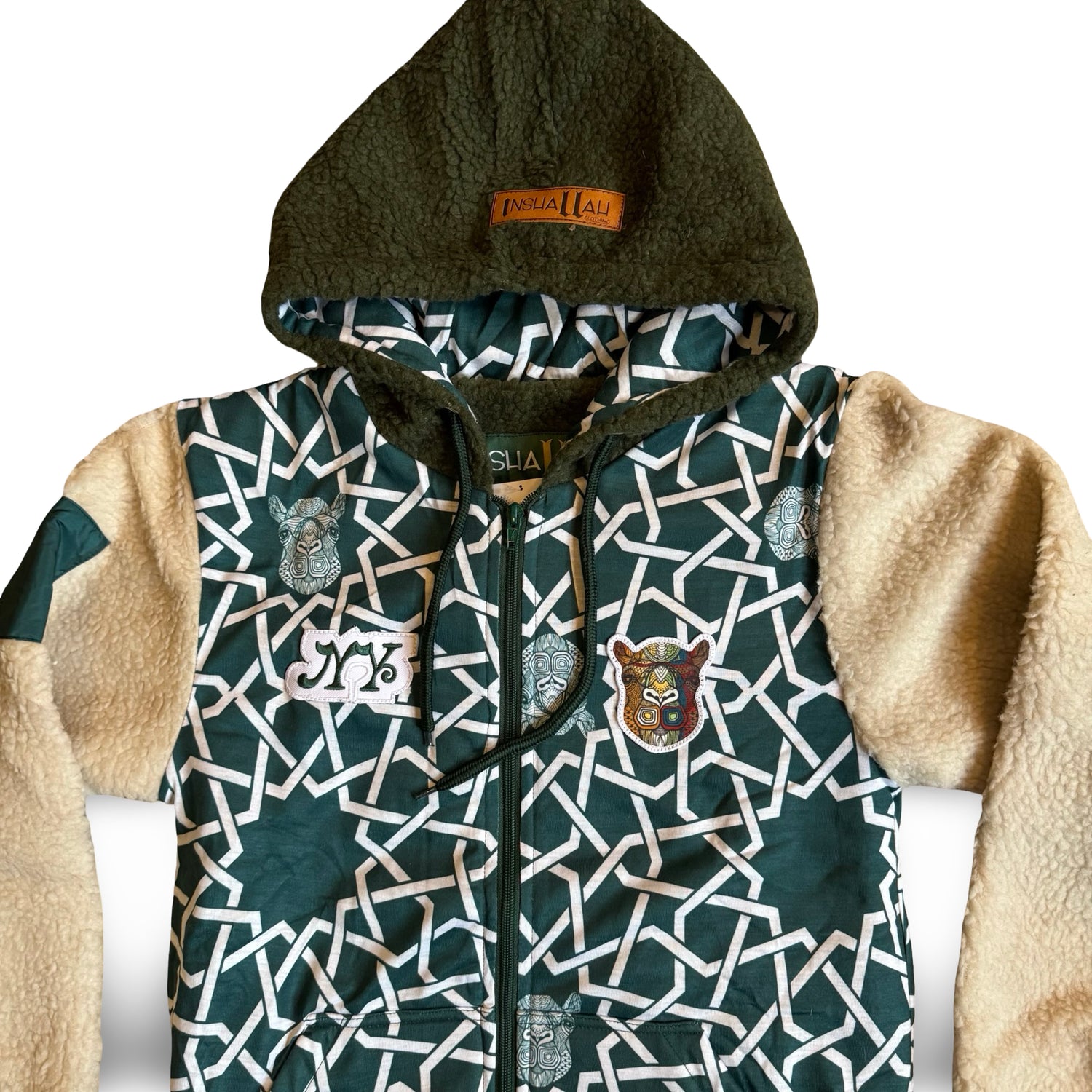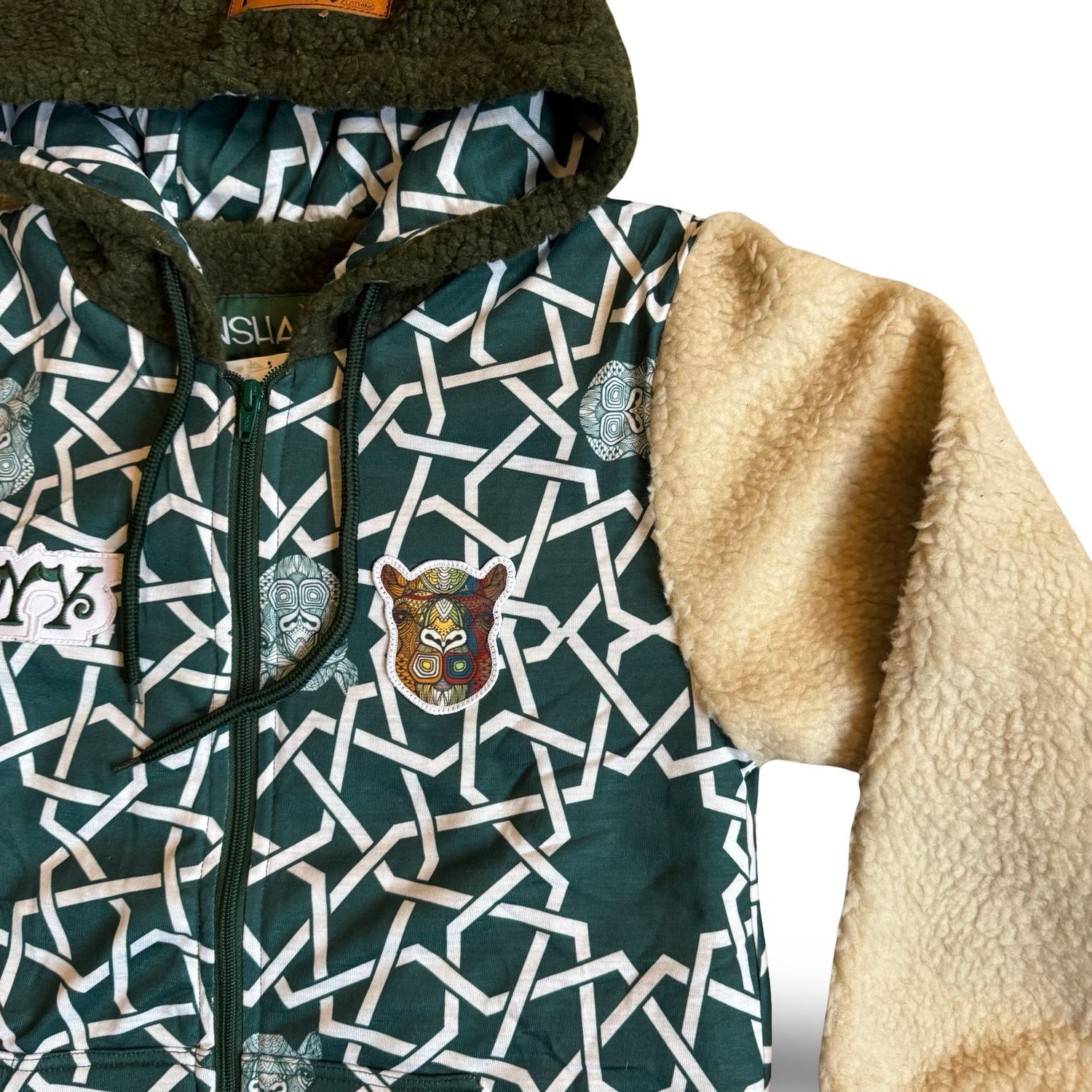 2 tone mid weight Shepra fleece hoodie/jacket with heavy embroidery and appliqué patchwork detailing..