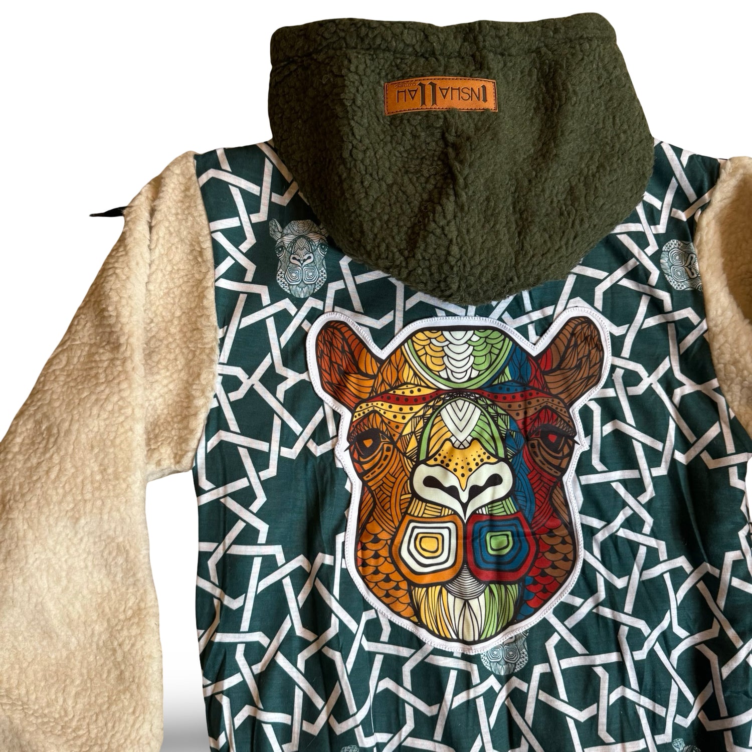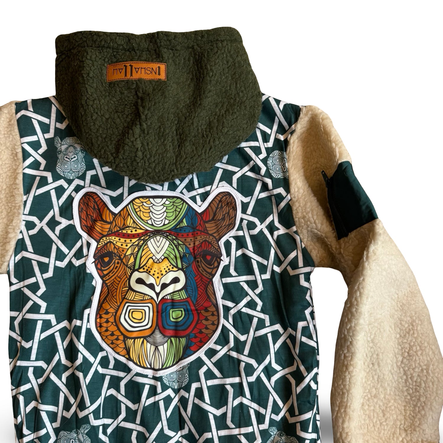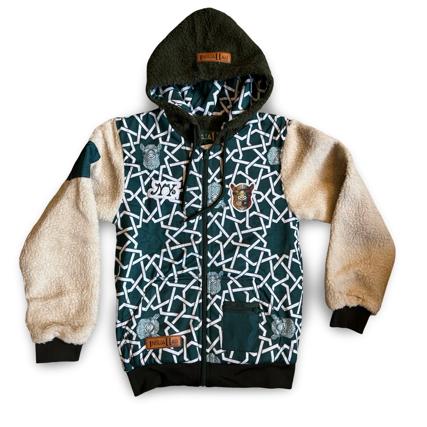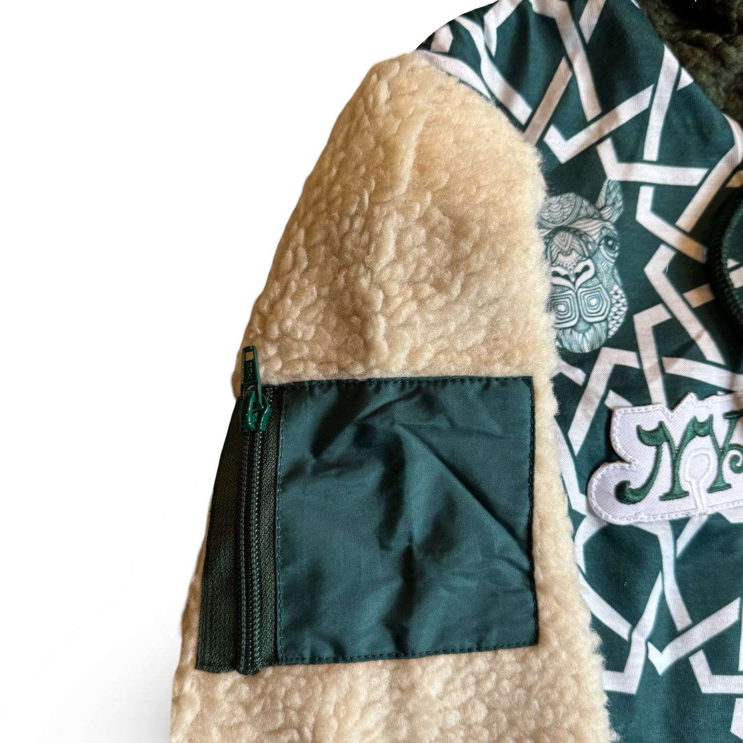 2 tone mid weight Shepra fleece hoodie/jacket with heavy embroidery and appliqué patchwork detailing..