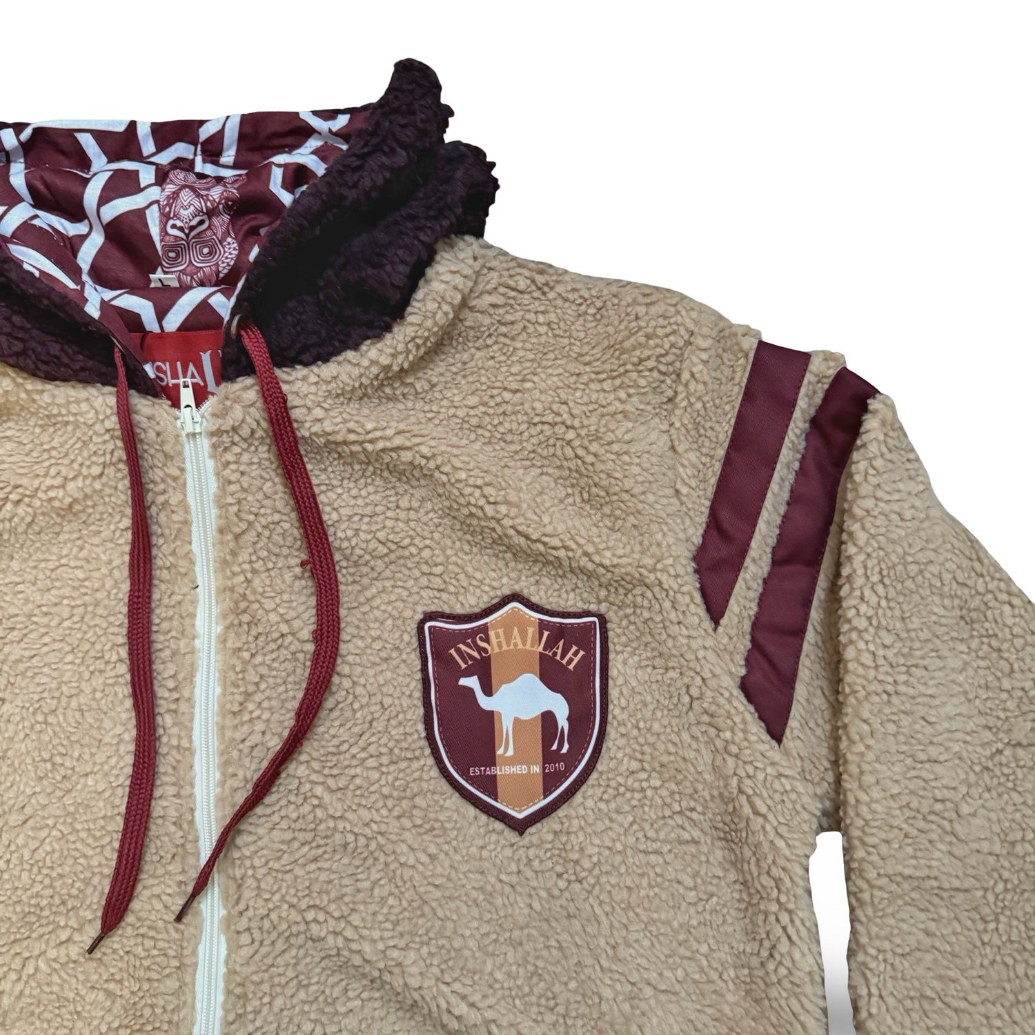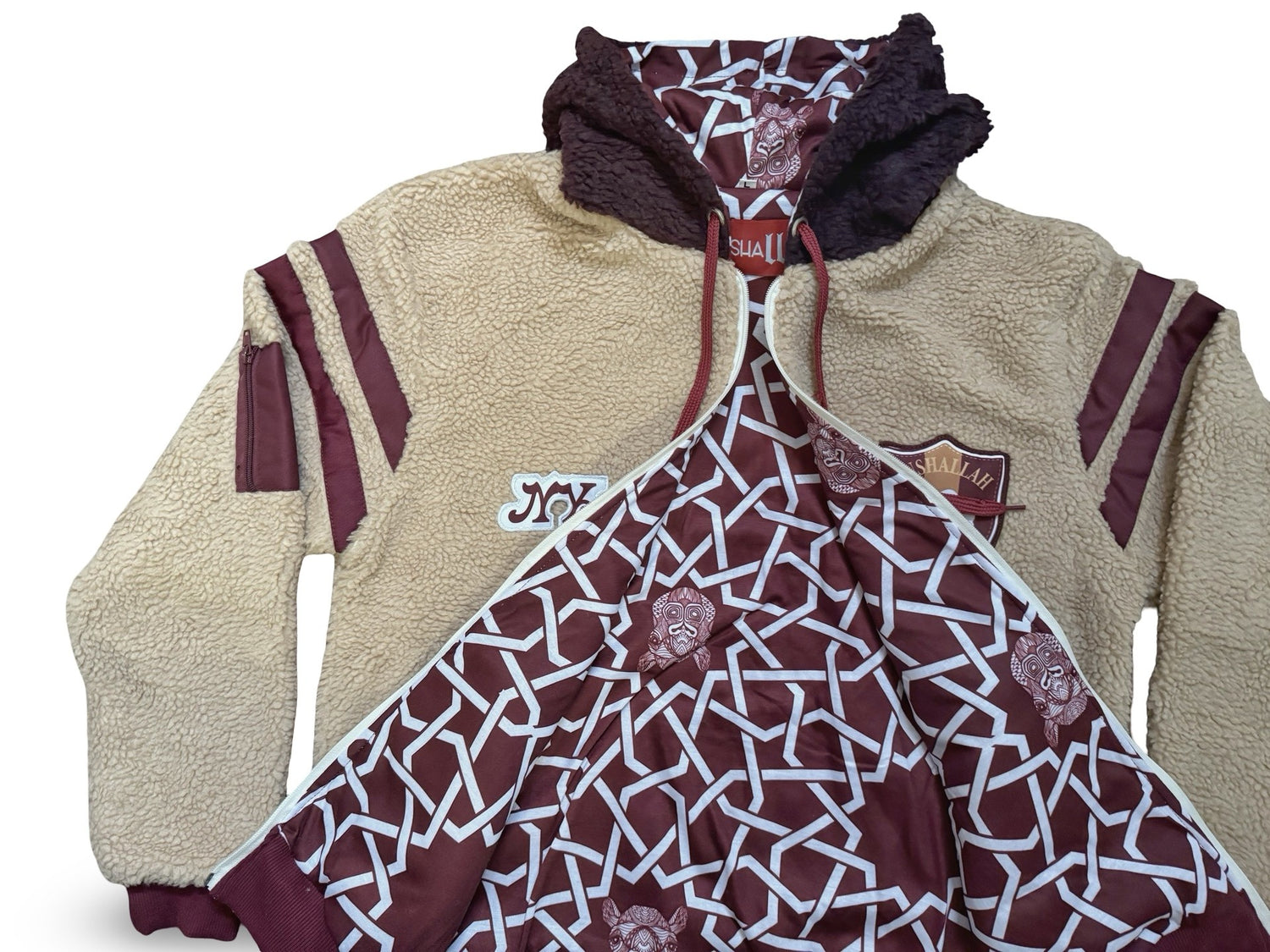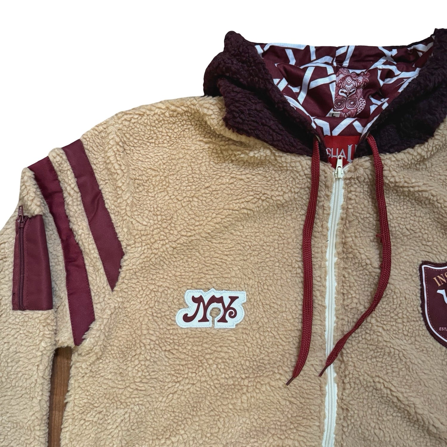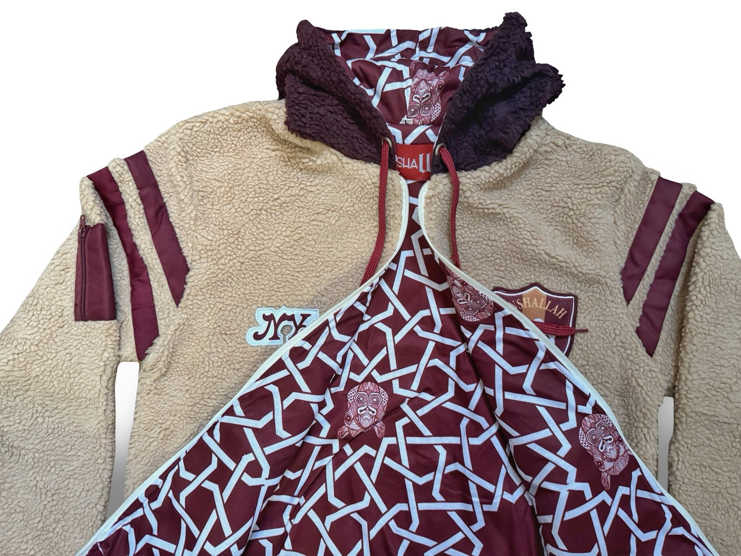 2 tone mid weight Shepra fleece hoodie/jacket with heavy embroidery and appliqué patchwork detailing..