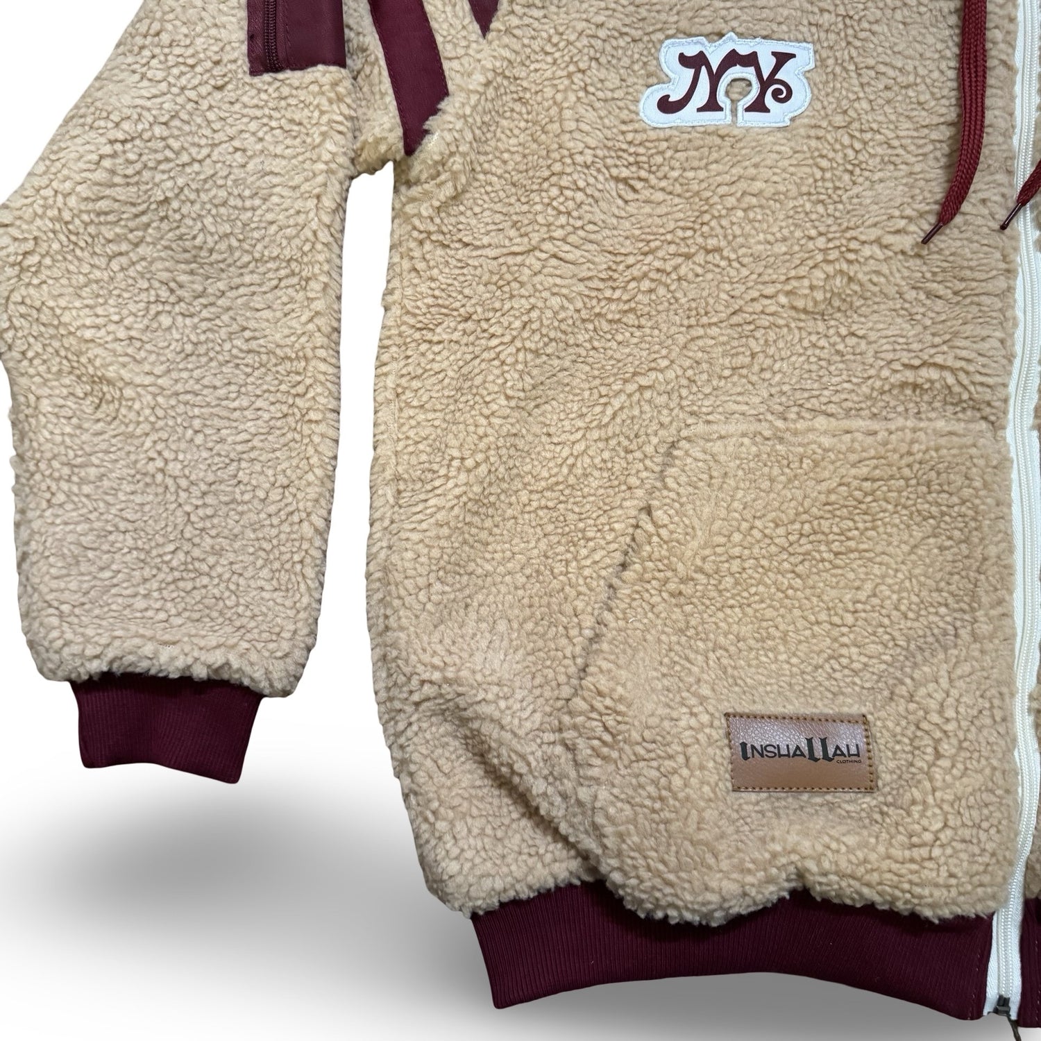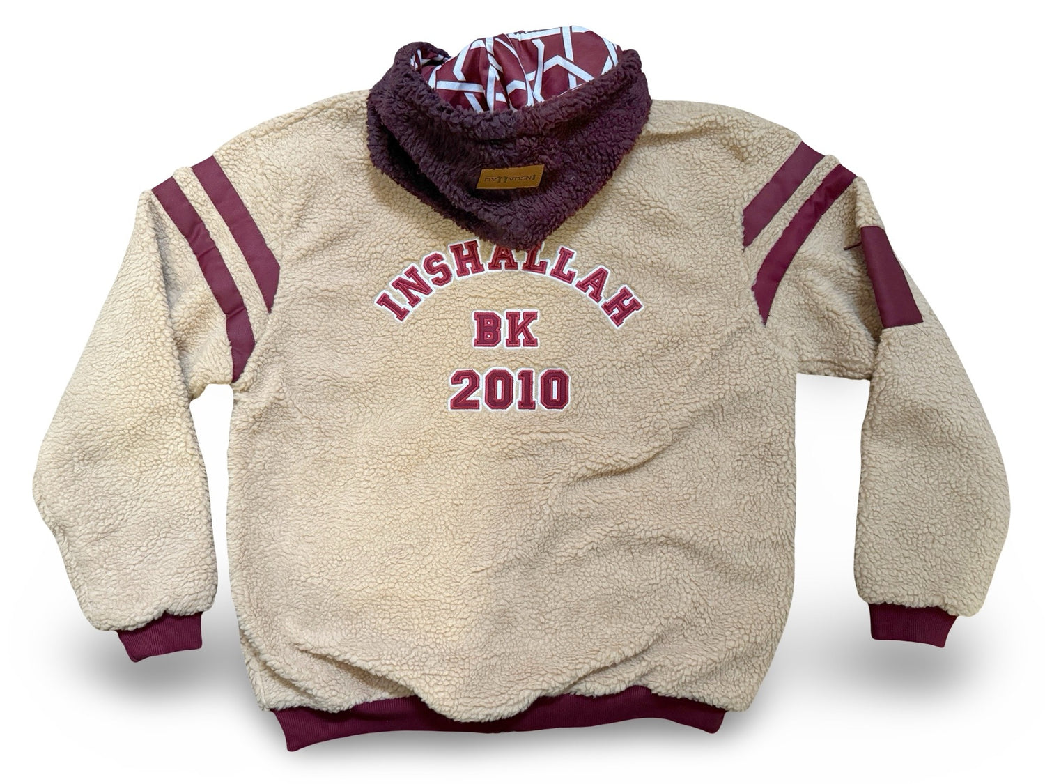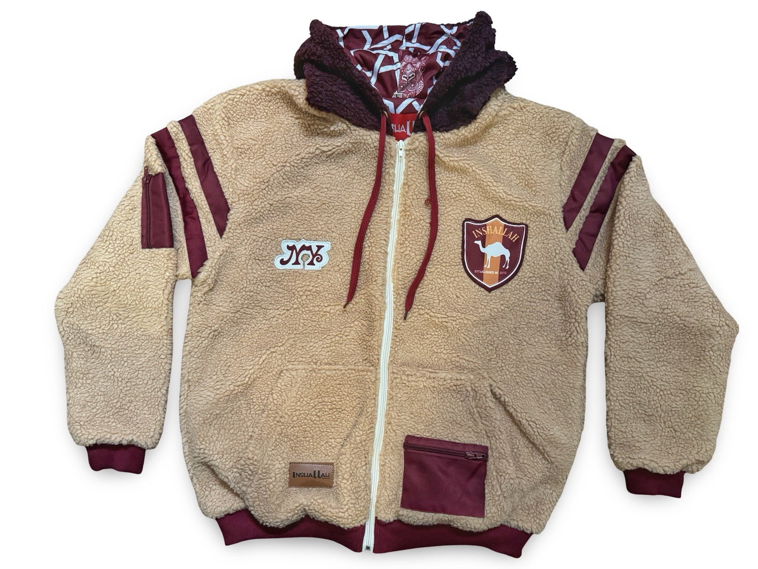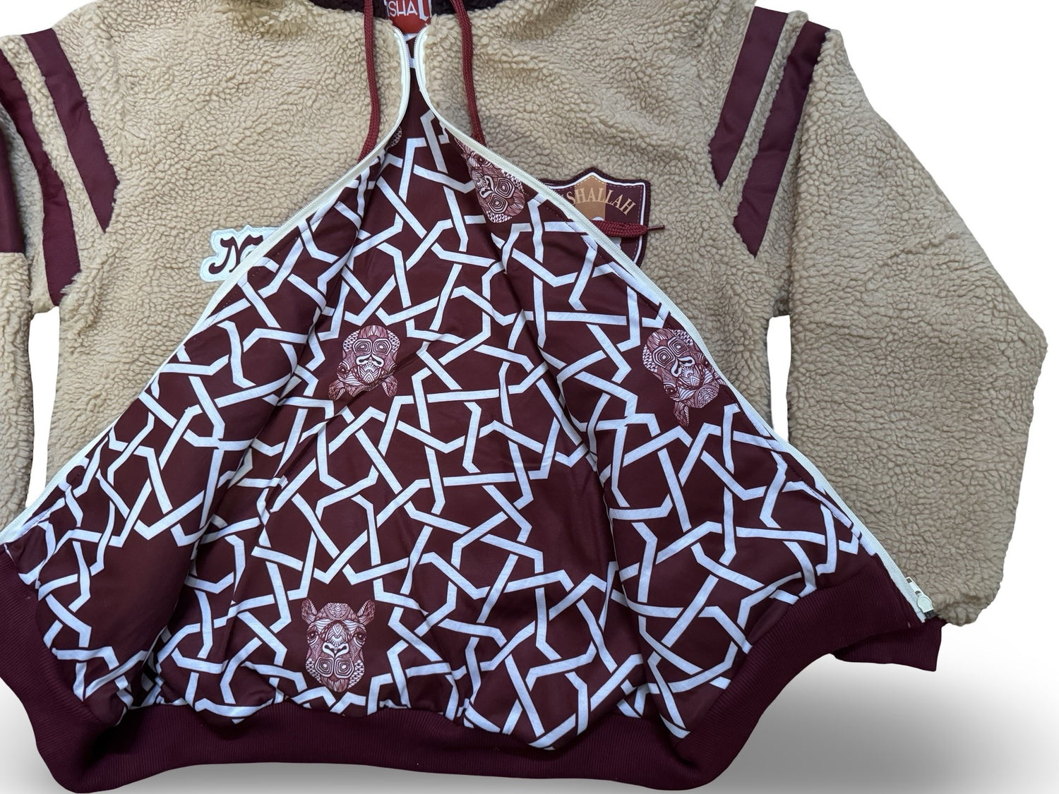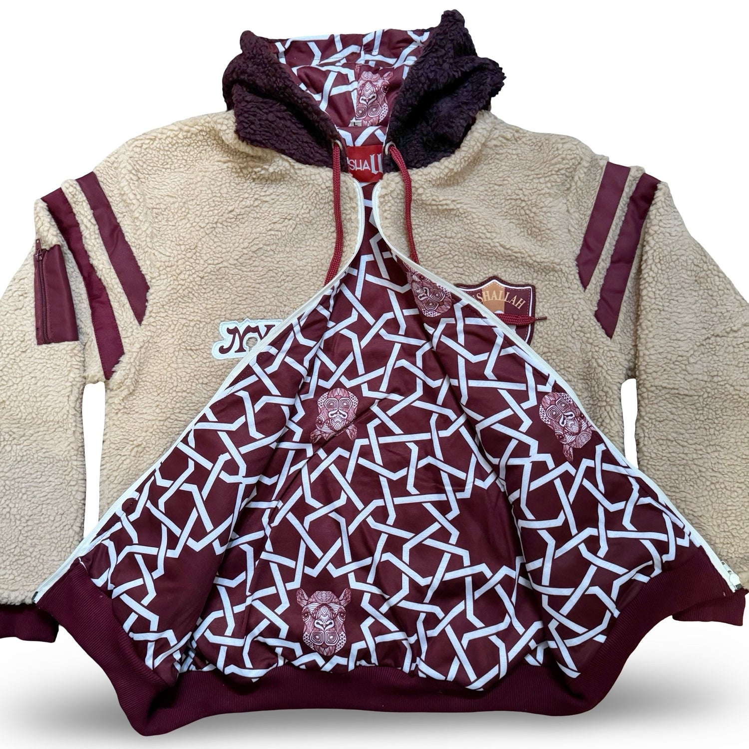 2 tone mid weight Shepra fleece hoodie/jacket with heavy embroidery and appliqué patchwork detailing..