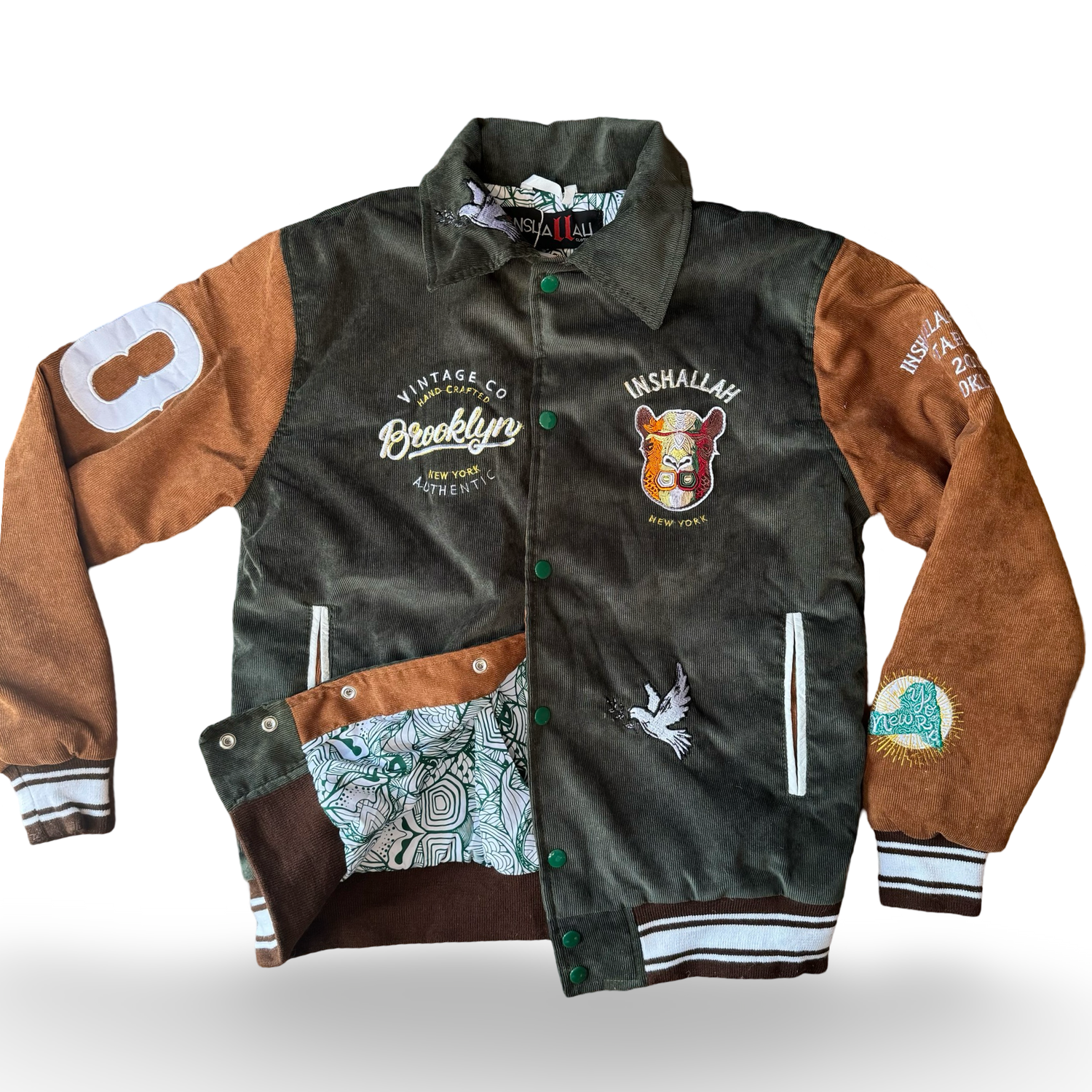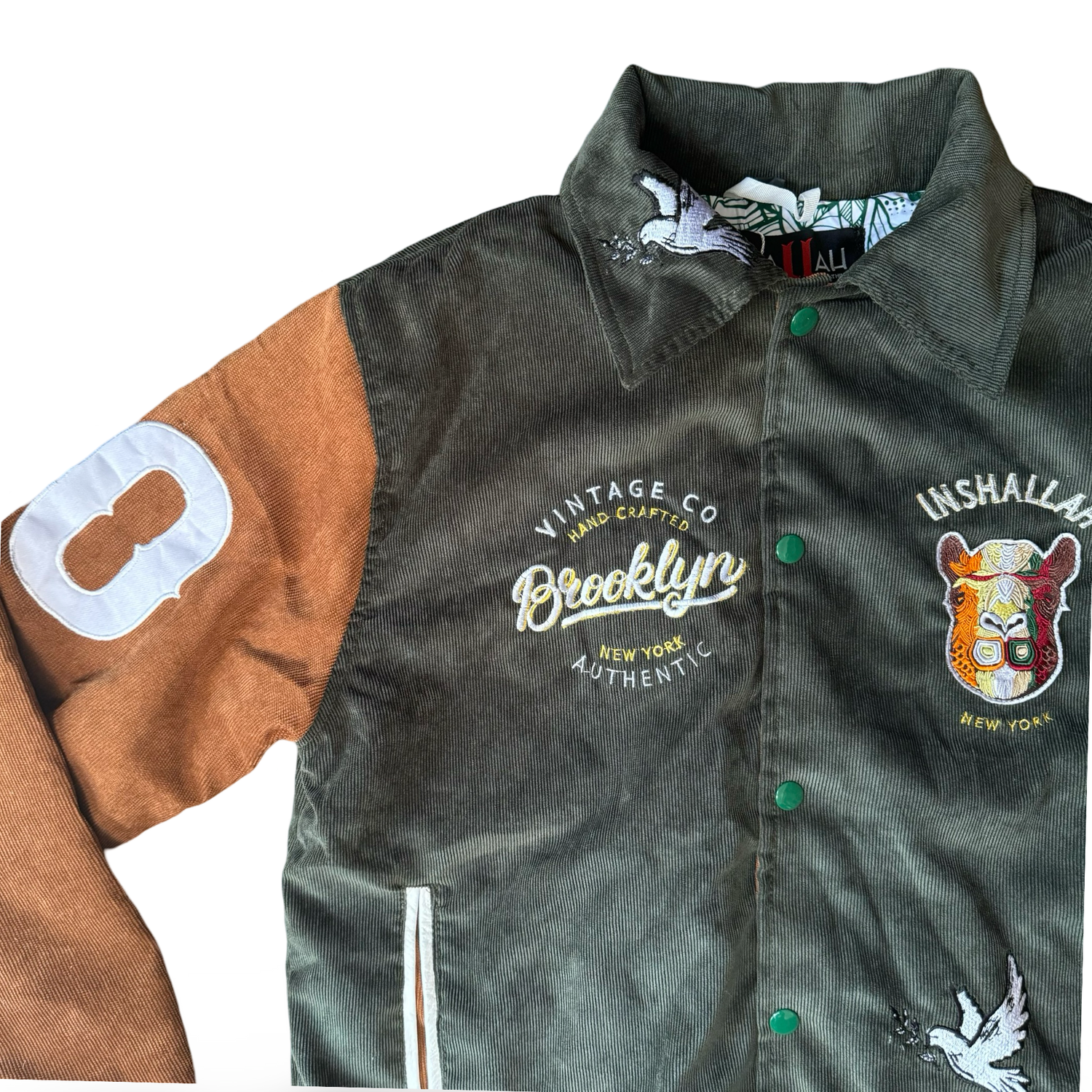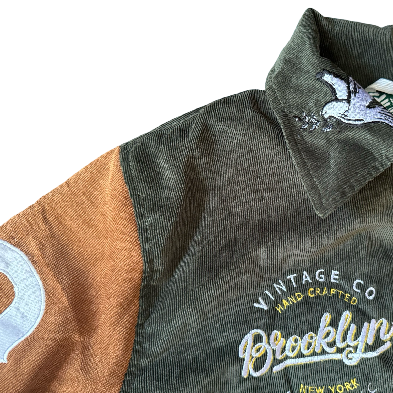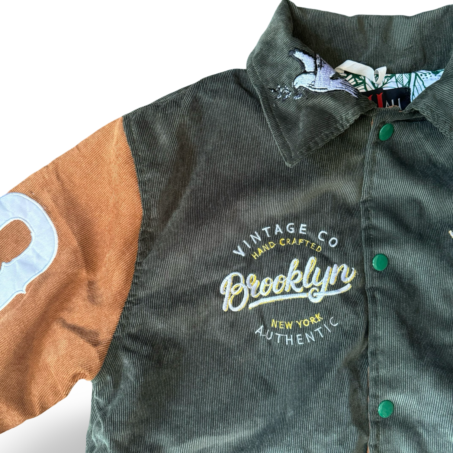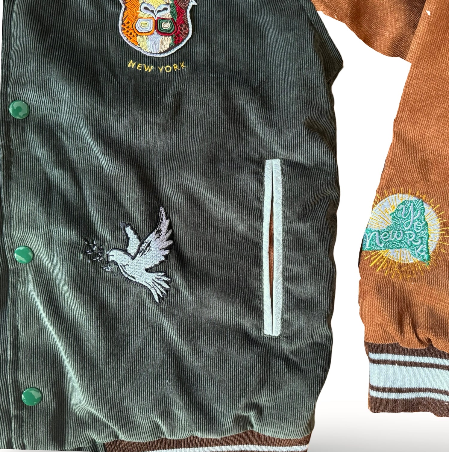2 tone mid weight corduroy style varsity jacket with heavy embroidery and appliqué patchwork detailing..