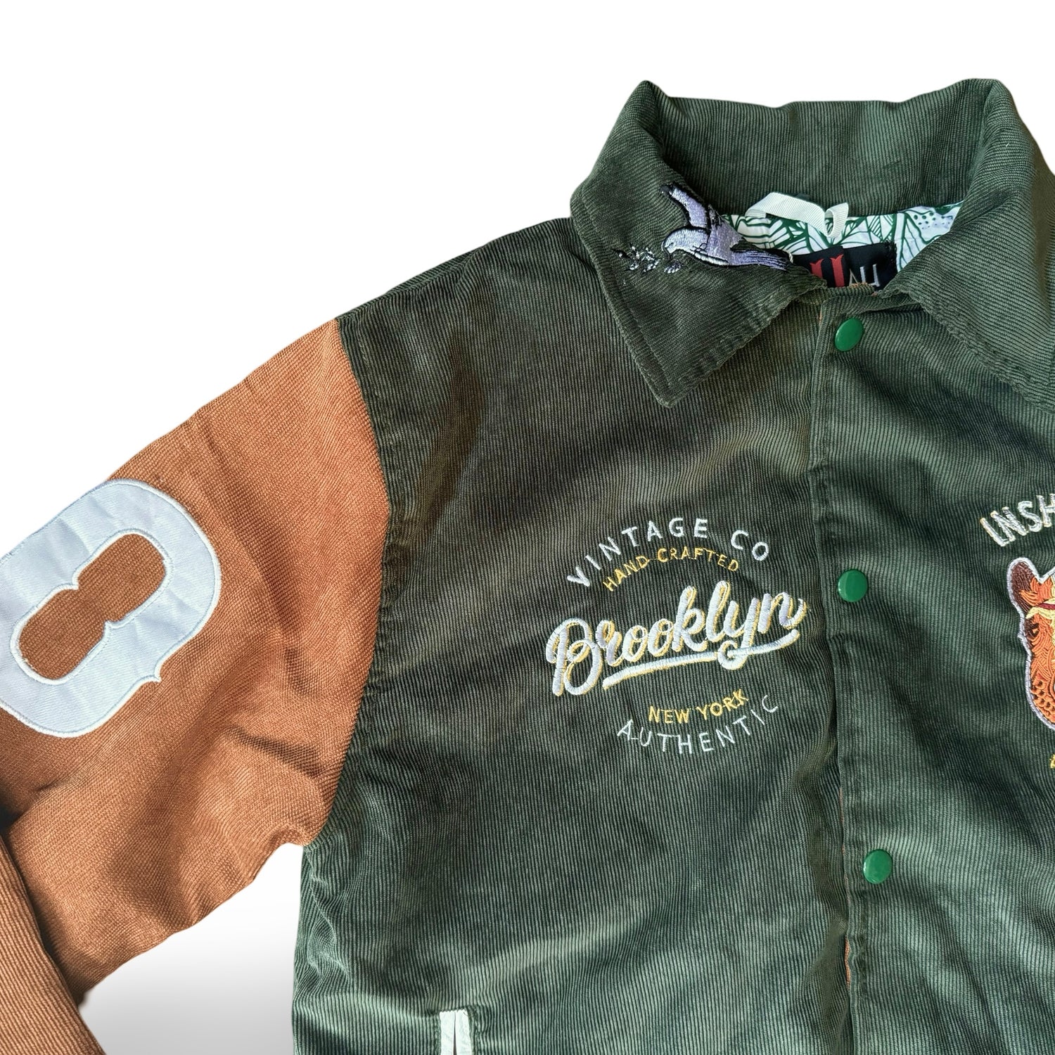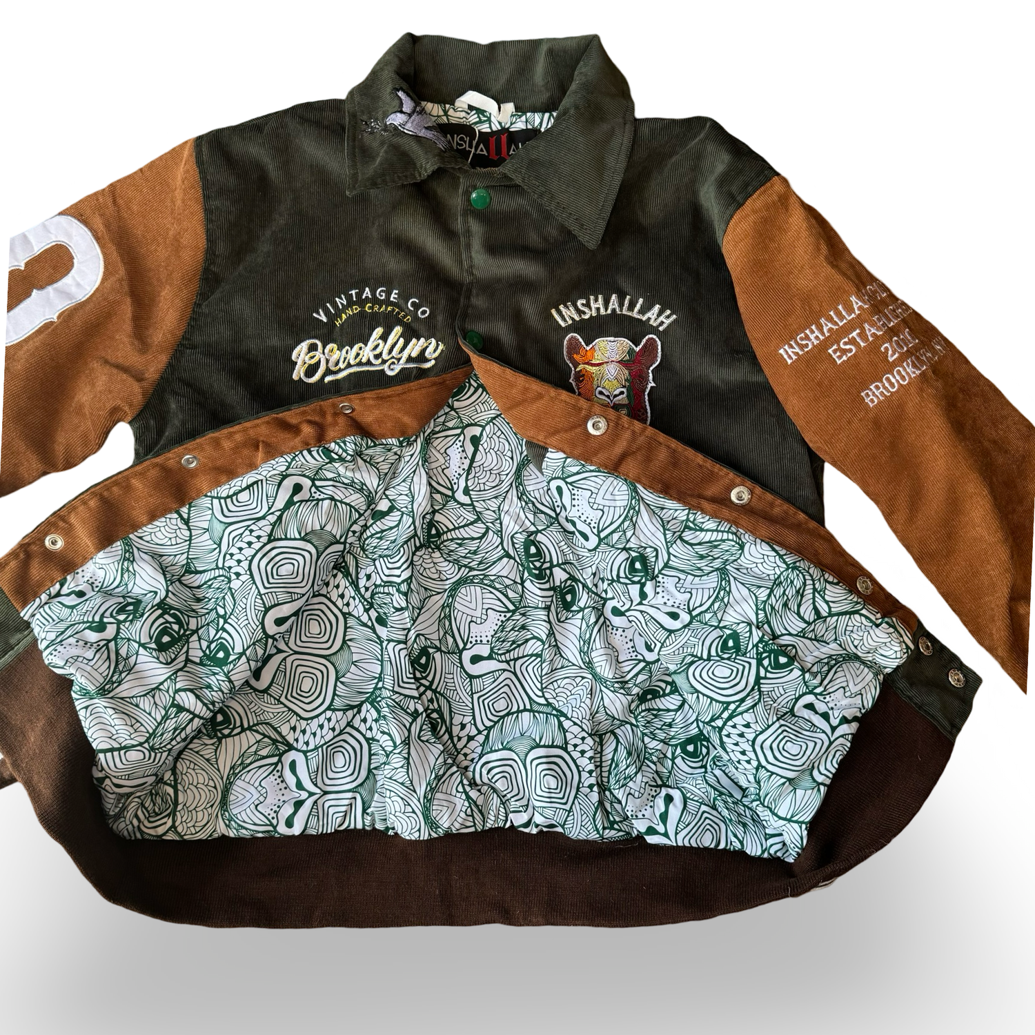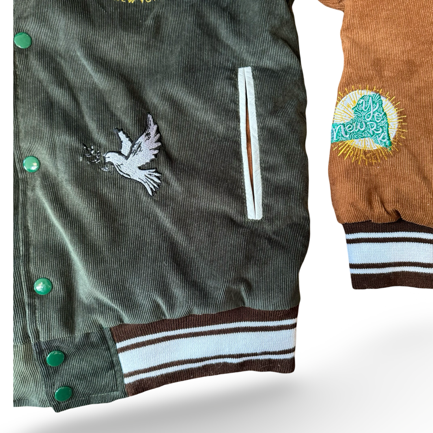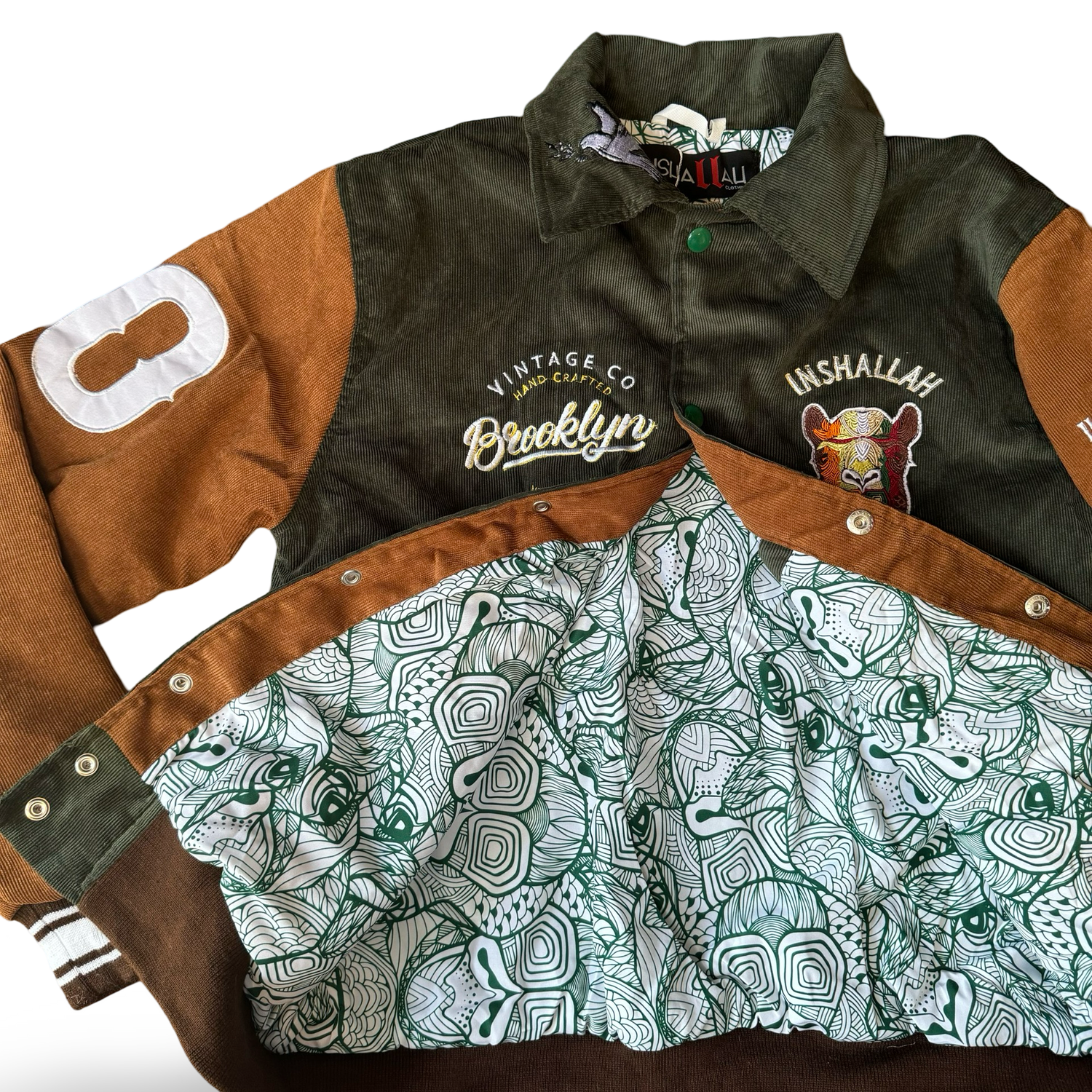 2 tone mid weight corduroy style varsity jacket with heavy embroidery and appliqué patchwork detailing..