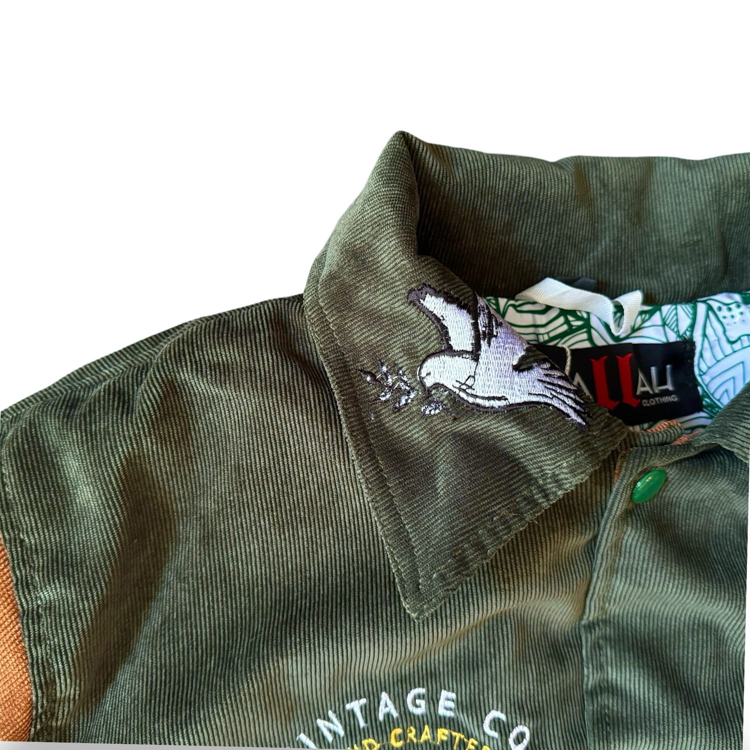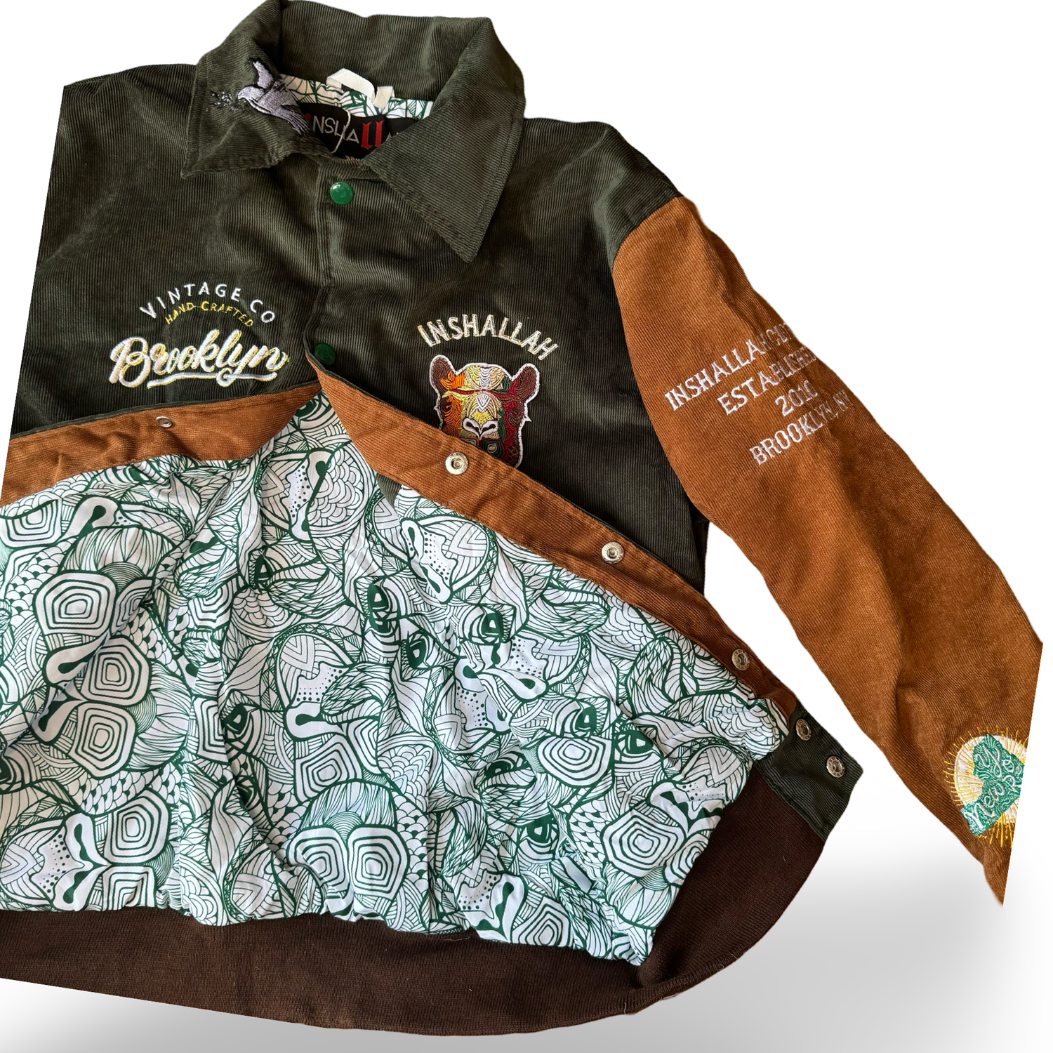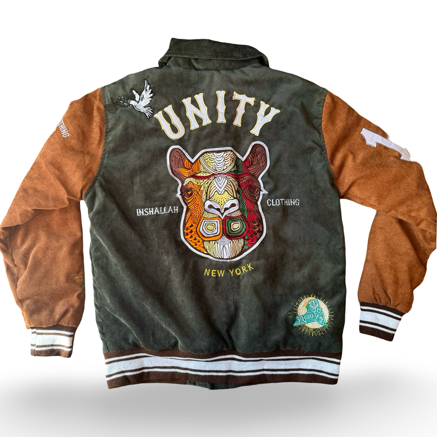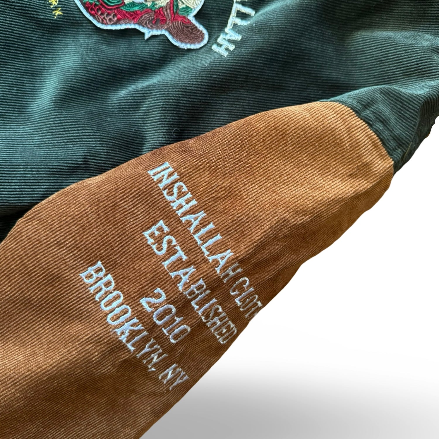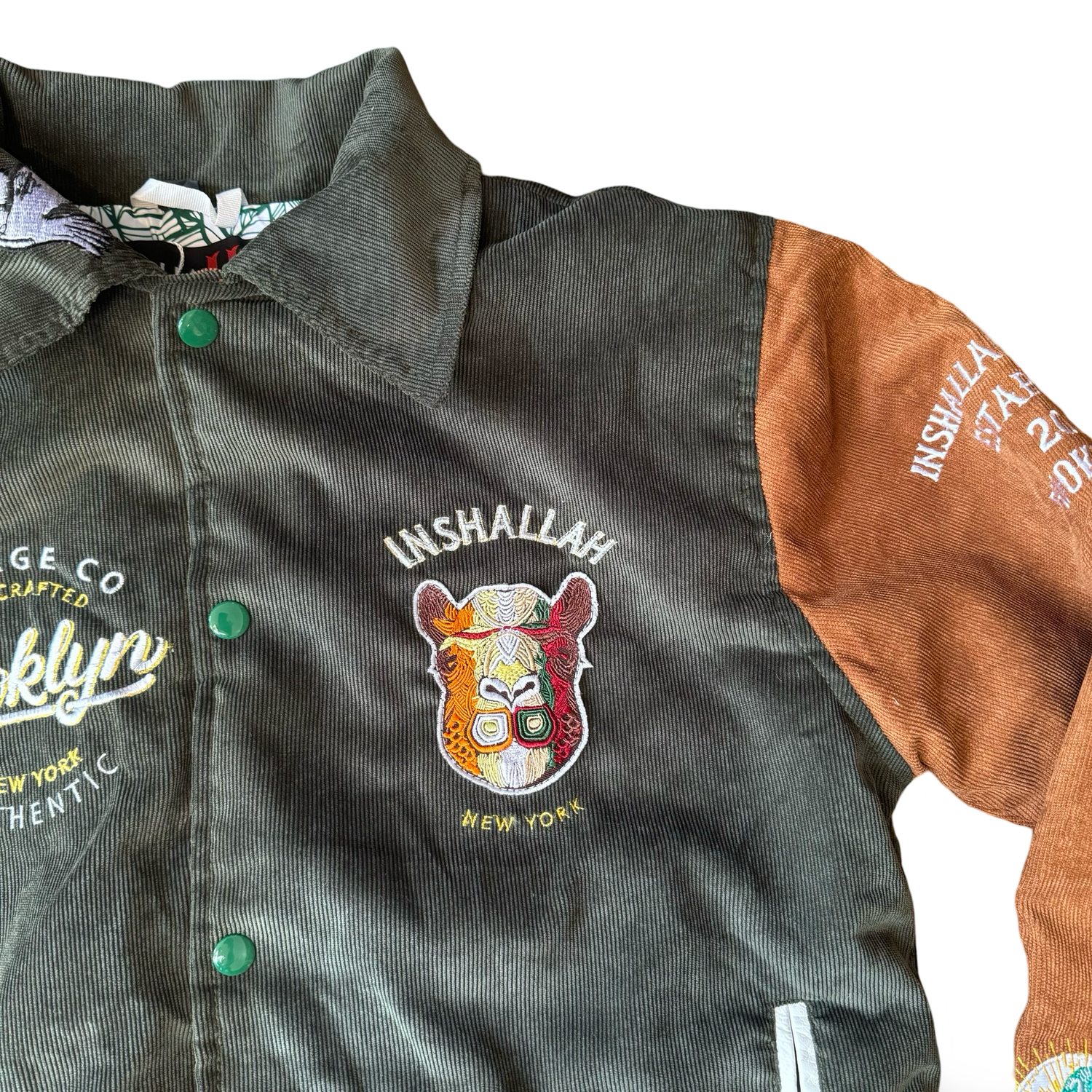 2 tone mid weight corduroy style varsity jacket with heavy embroidery and appliqué patchwork detailing..