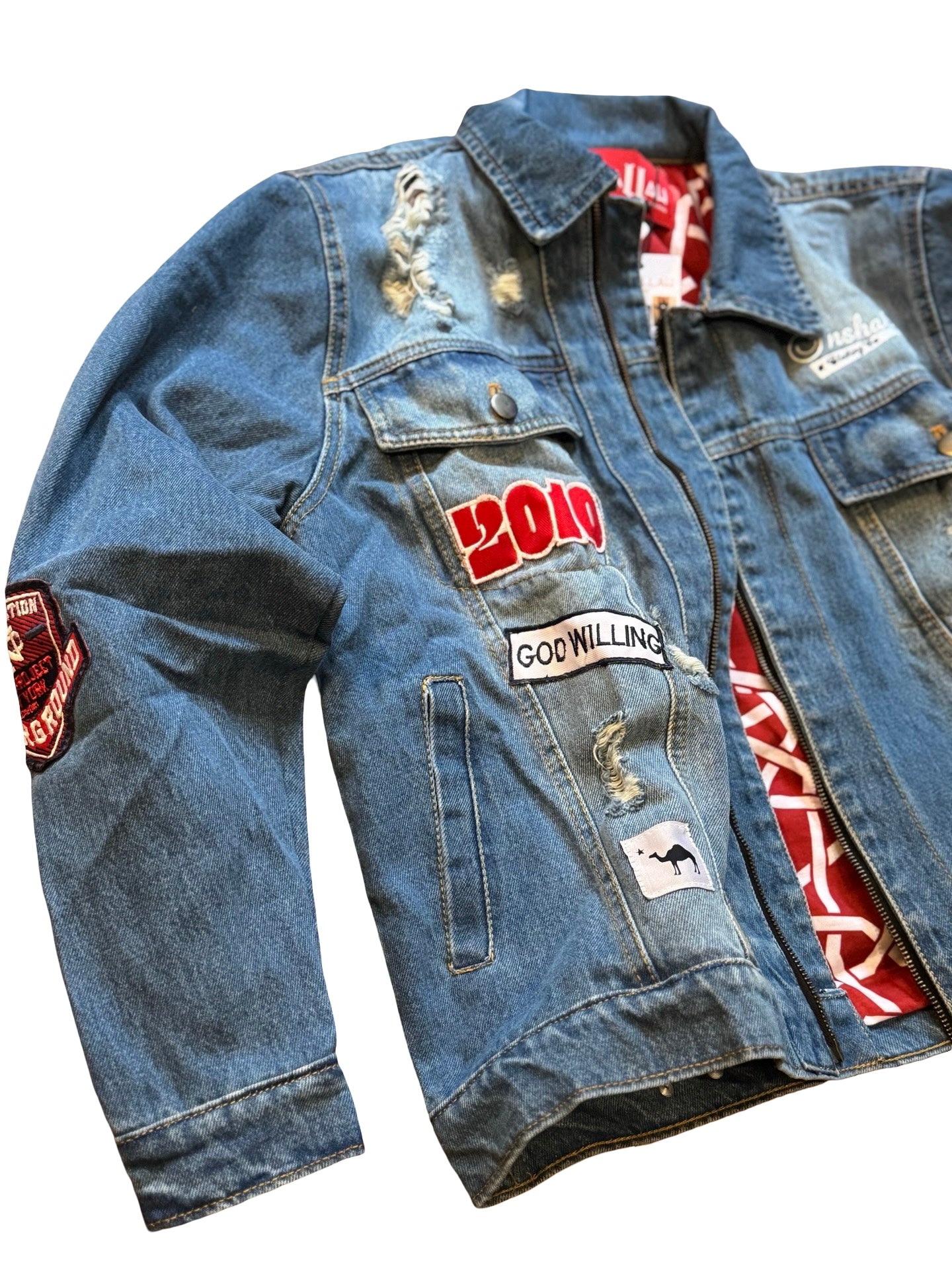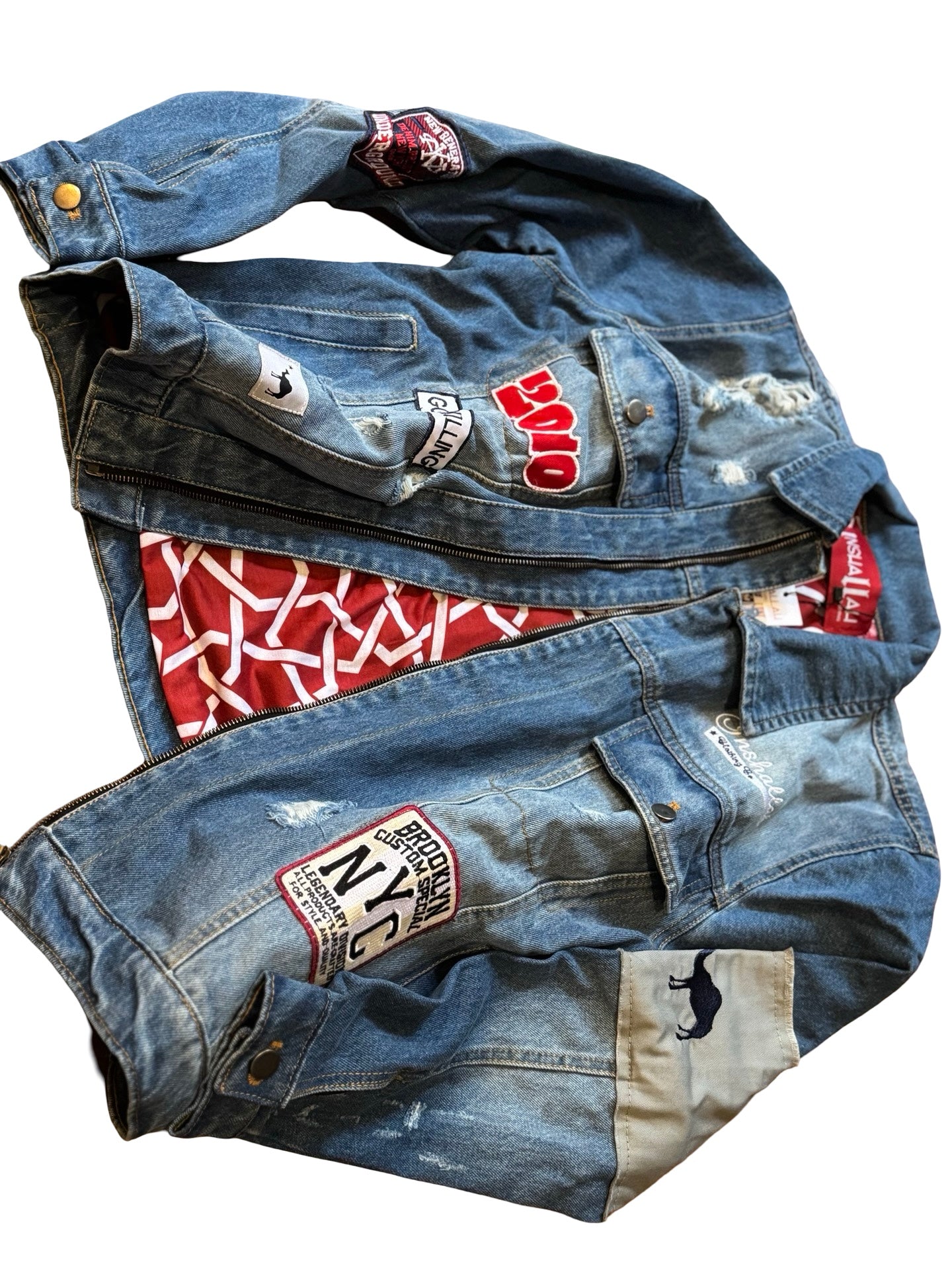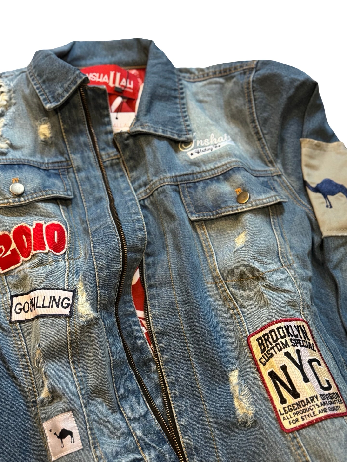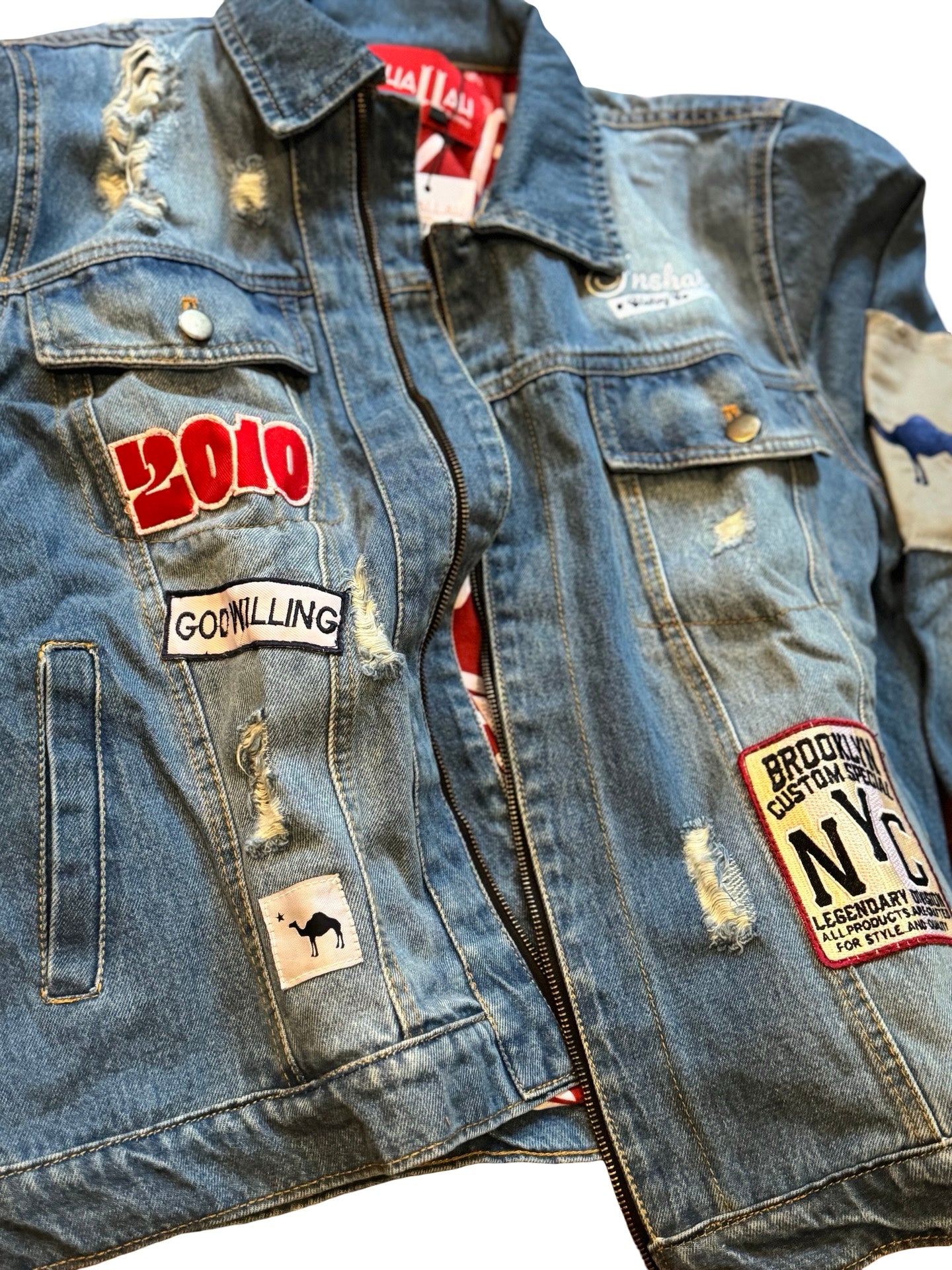 Heavy denim jacket with heavy embroidery and appliqué patchwork detailing..