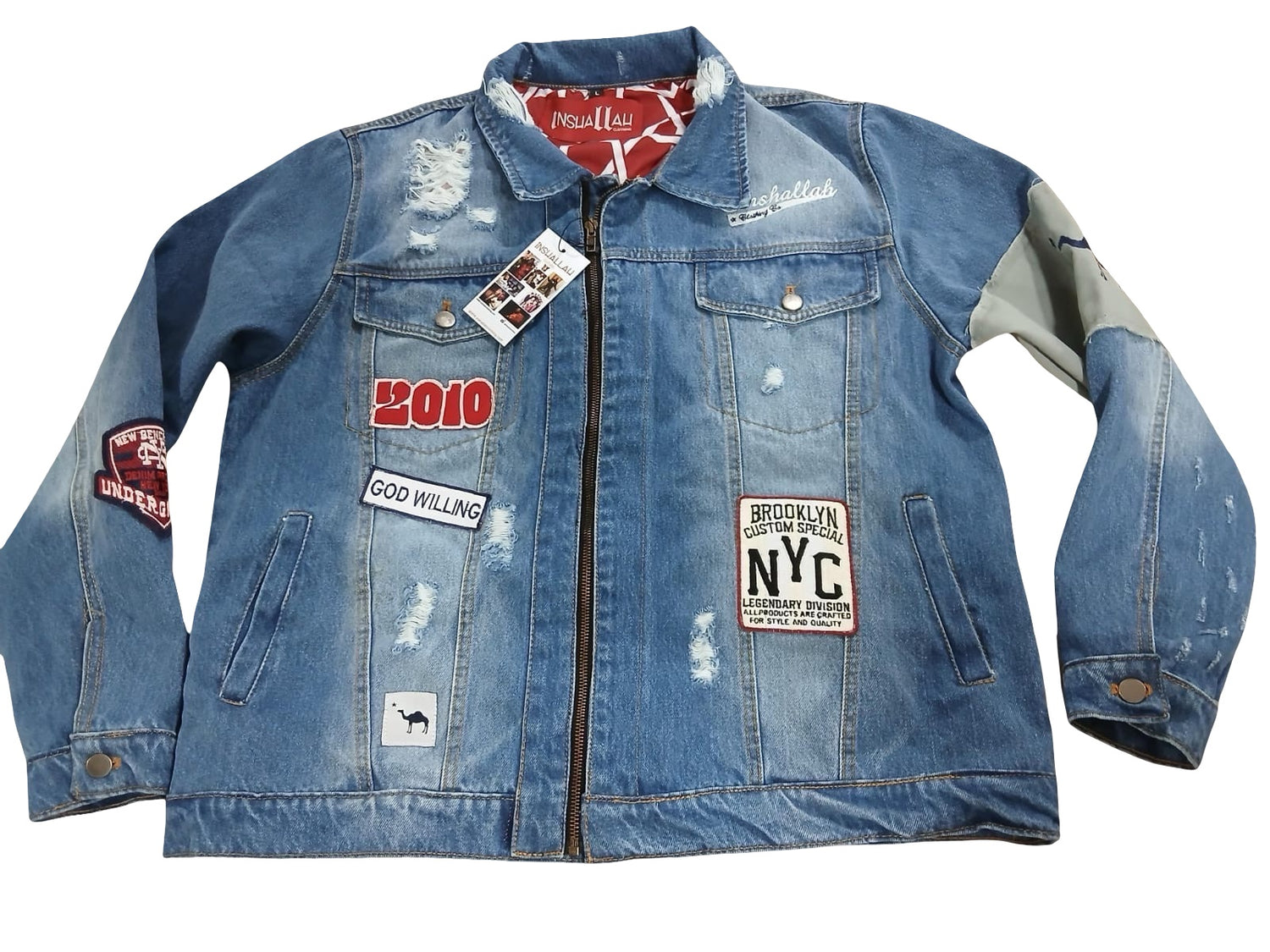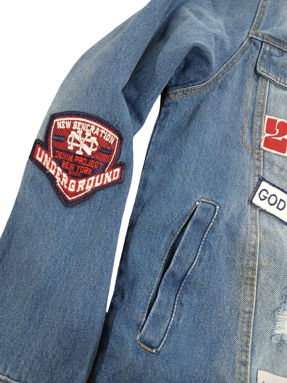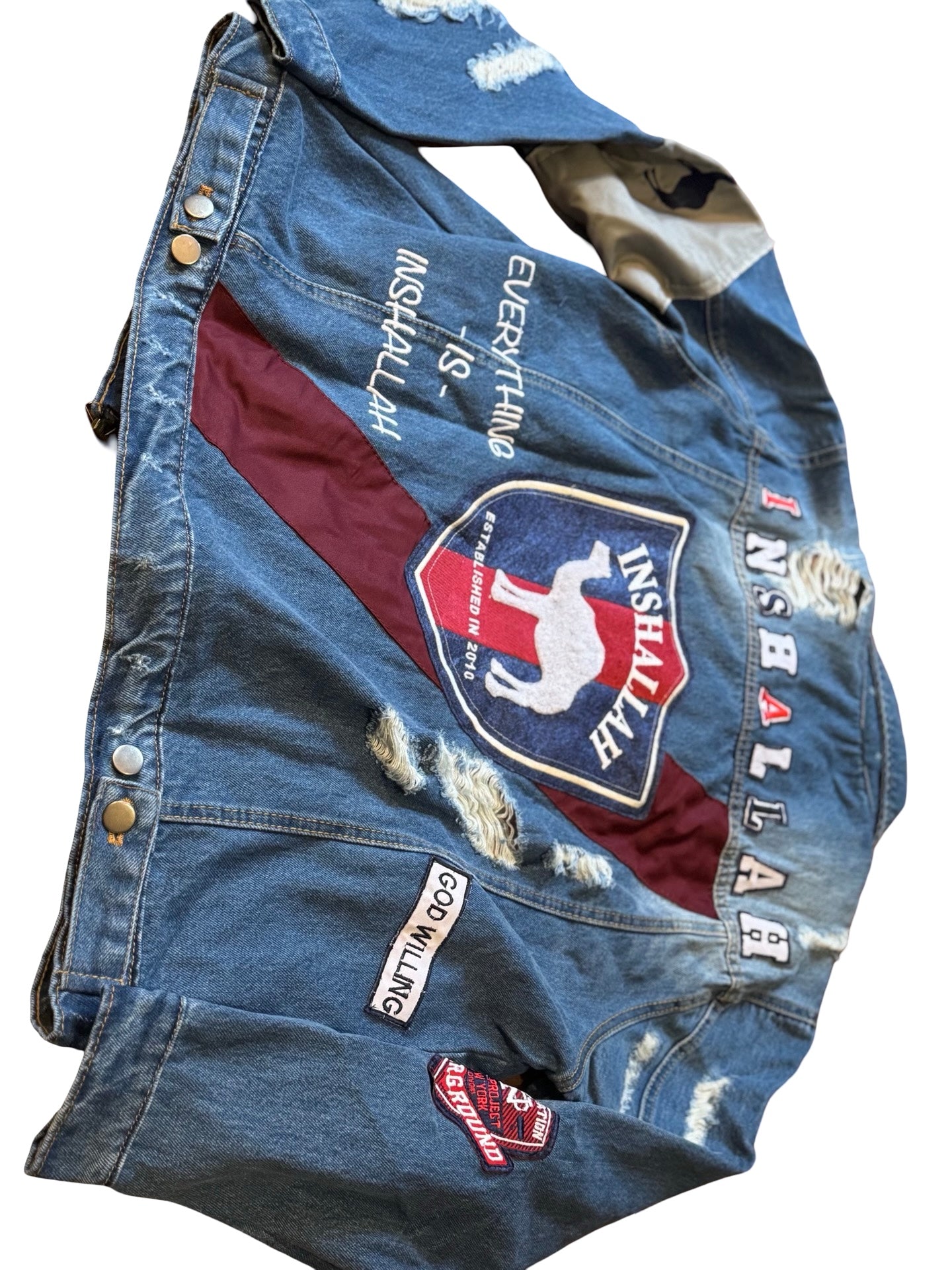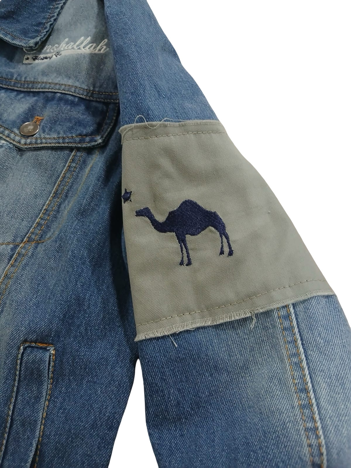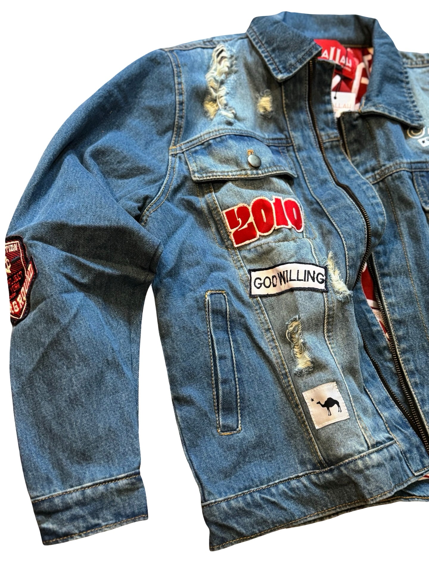 Heavy denim jacket with heavy embroidery and appliqué patchwork detailing..